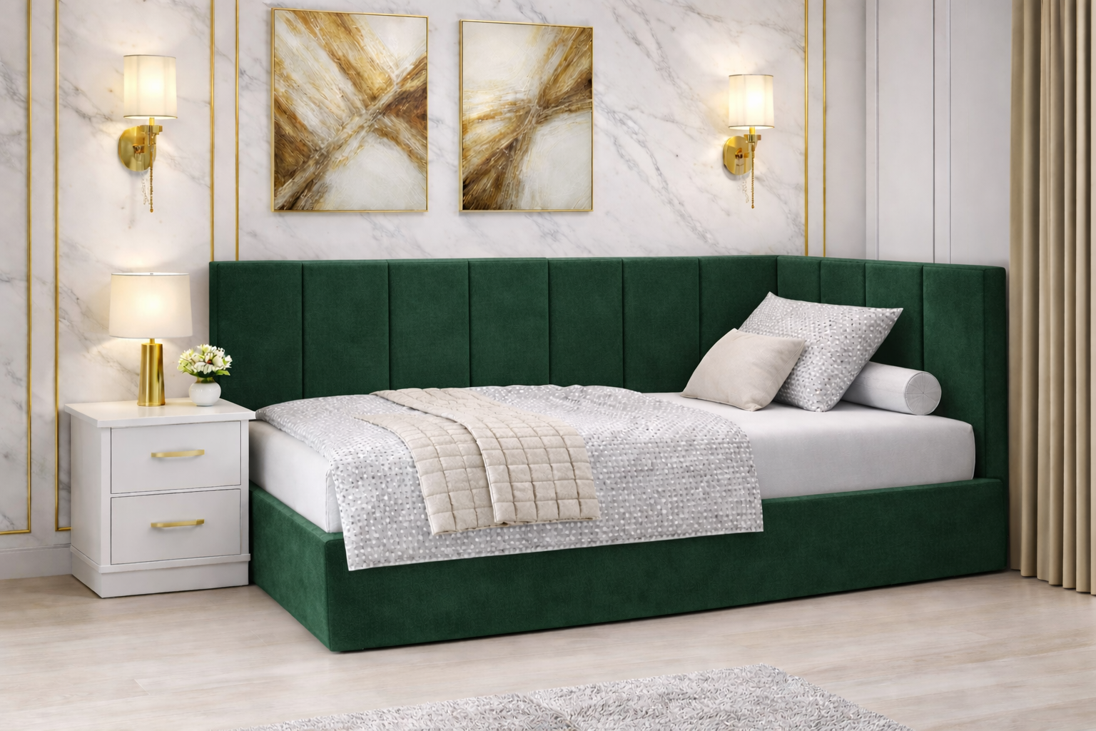 Tapițat în material catifelat, plăcut la atingere și disponibil în mai multe culori moderne, acest model oferă un plus de confort și stil dormitorului tău.