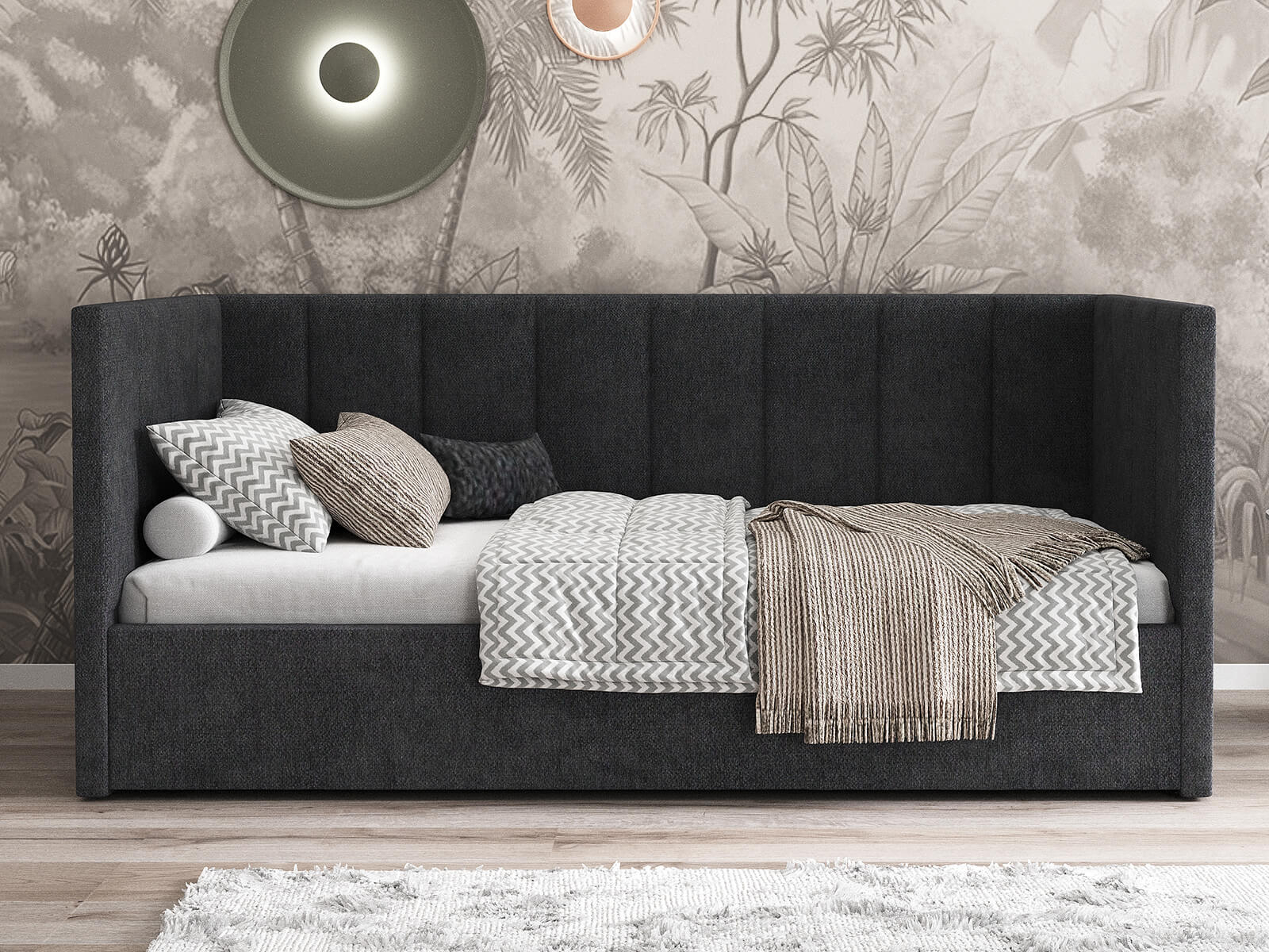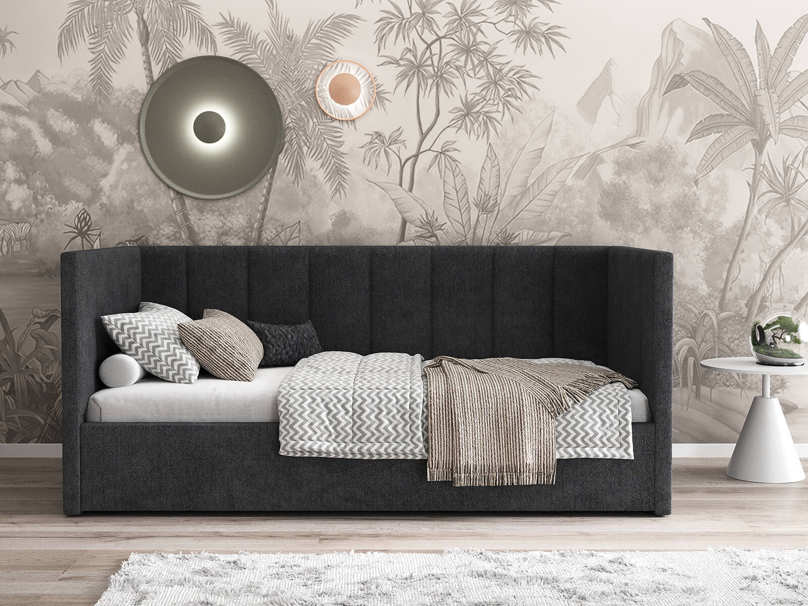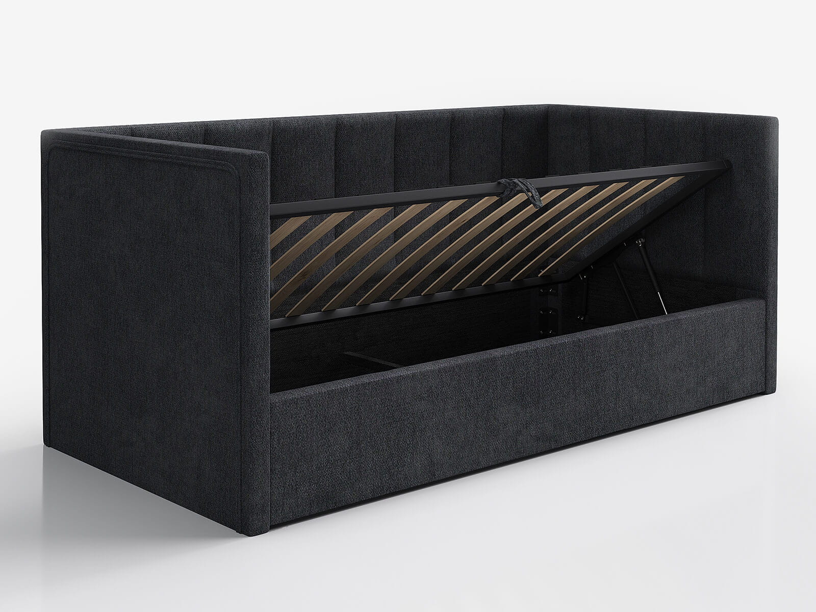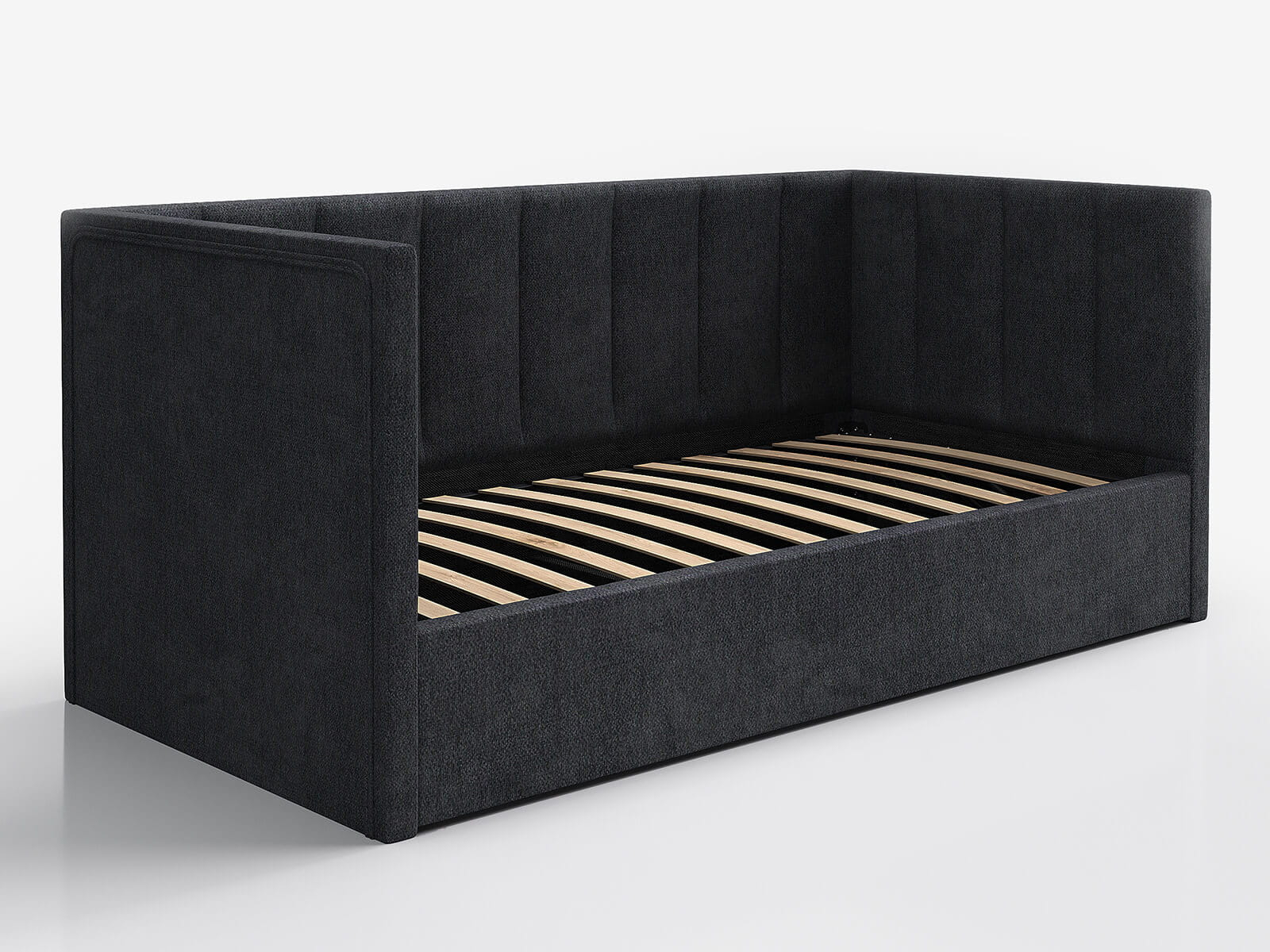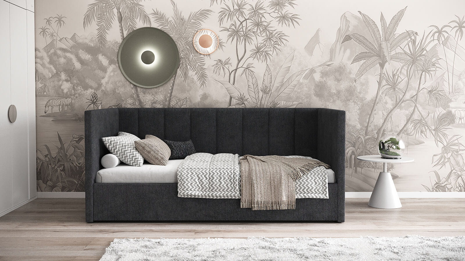 Structura solidă oferă stabilitate și durabilitate, iar designul cu spătar și laterale tapițate permite folosirea canapelei atât ca pat, cât și ca zonă confortabilă de relaxare pe timpul zilei. Somiera cu lamele susține corect salteaua și contribuie la un nivel optim de confort în timpul somnului.