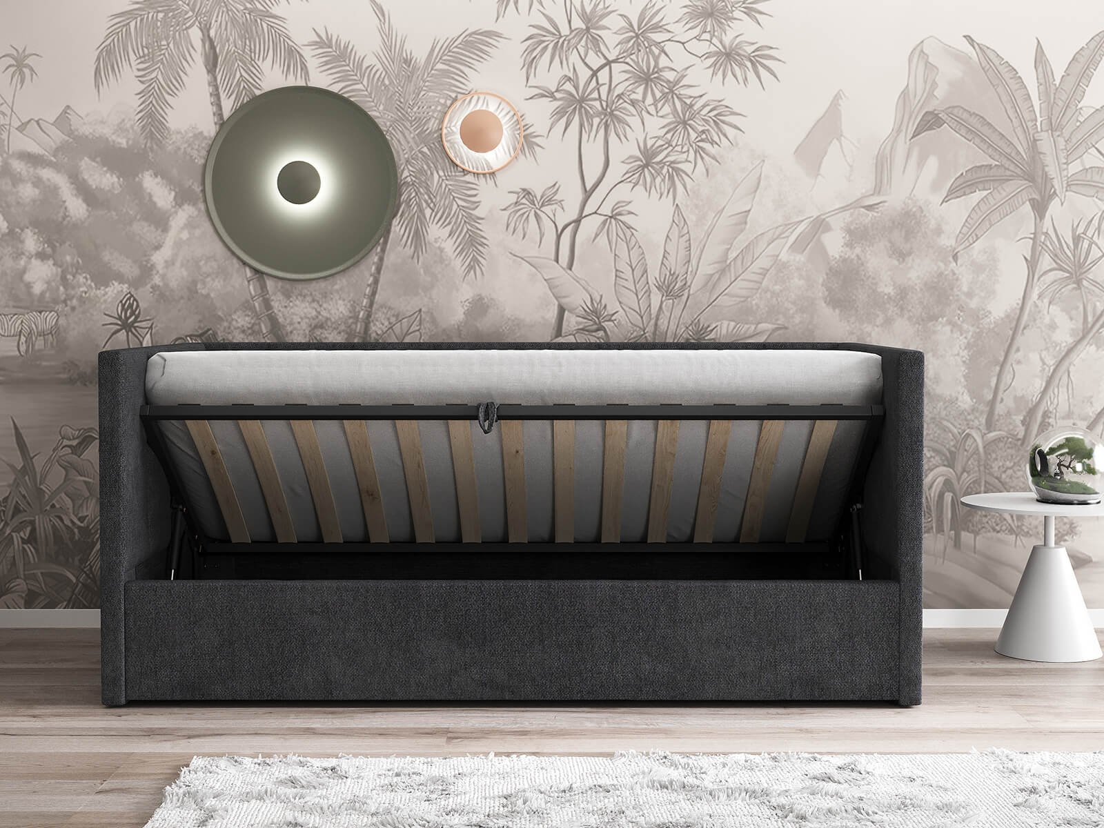 Modelul este prevăzut cu somieră rabatabilă, ușor de utilizat, care permite acces rapid la un spațiu de depozitare generos integrat sub suprafața de dormit. Mecanismul de ridicare este robust și sigur, asigurând o utilizare facilă în timp.