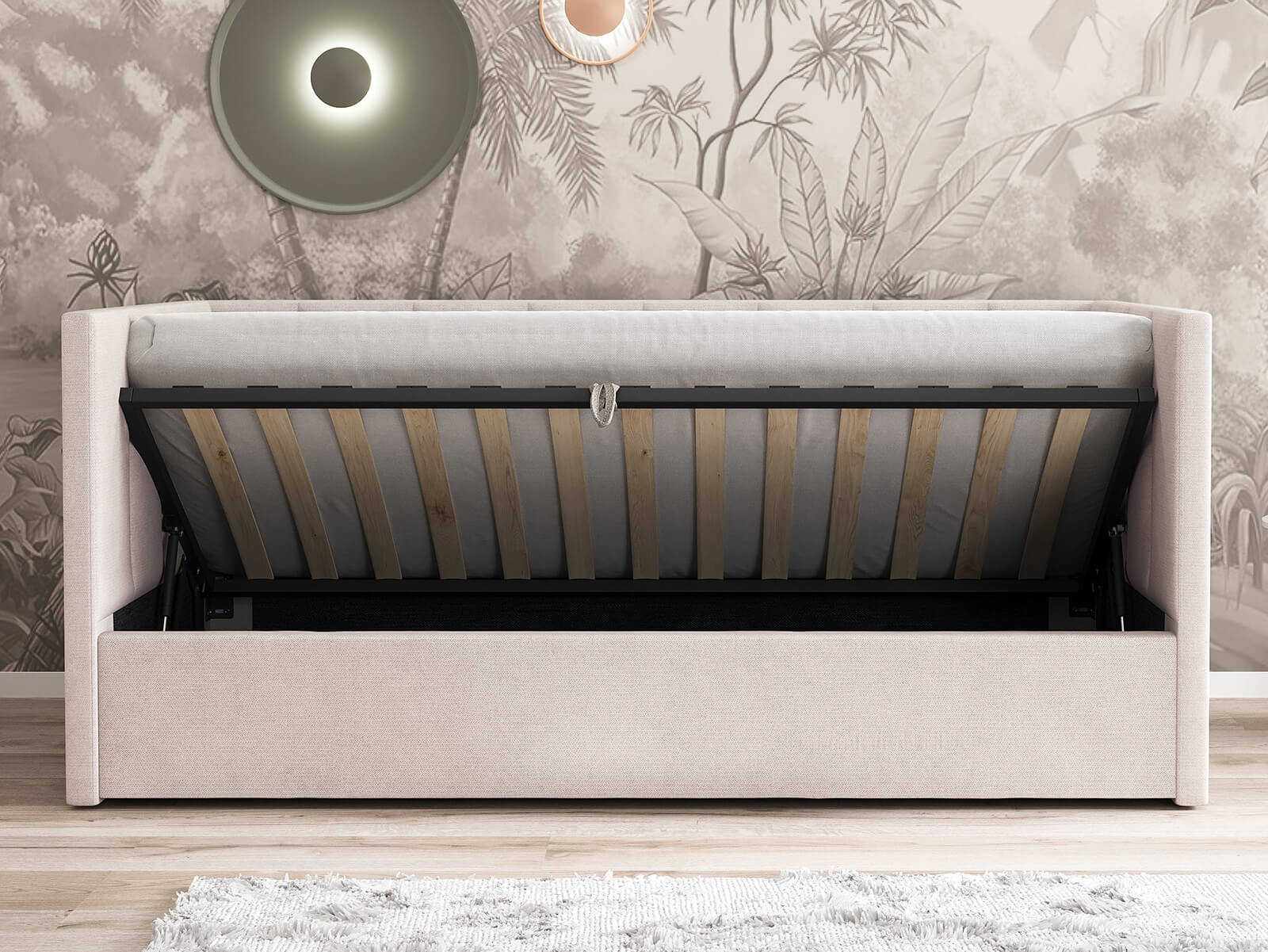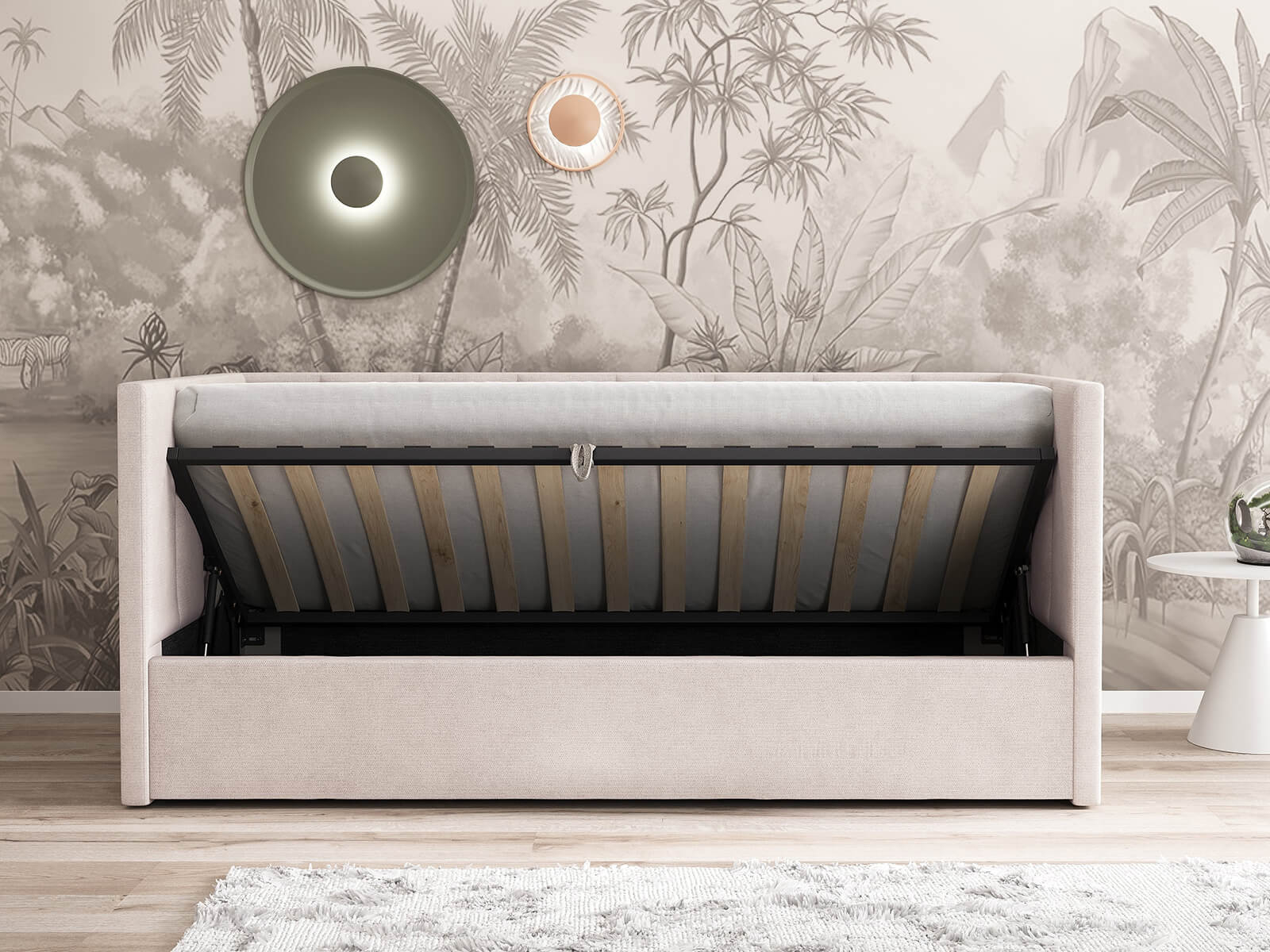 Modelul este prevăzut cu somieră rabatabilă, ușor de utilizat, care permite acces rapid la un spațiu de depozitare generos integrat sub suprafața de dormit. Mecanismul de ridicare este robust și sigur, asigurând o utilizare facilă în timp.