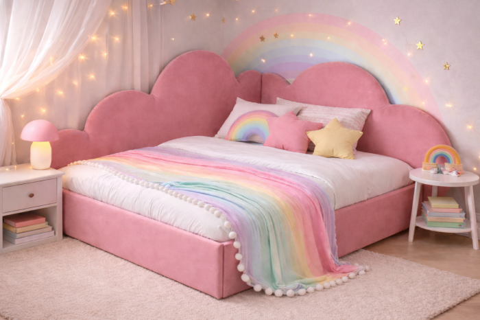 • Tăblie tapițată tip „norișori”, cu design atractiv pentru copii