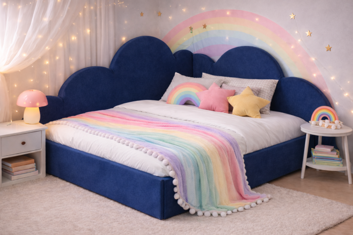 • Tăblie tapițată tip „norișori”, cu design atractiv pentru copii