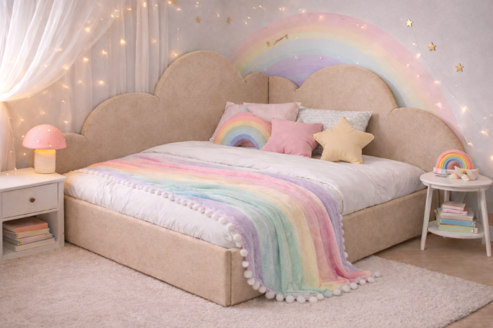 Patul Adelin este alegerea ideală pentru camera copilului, combinând un design vesel cu funcționalitate practică. Tăblia tapițată în formă de nori creează o atmosferă caldă și relaxantă, perfectă pentru un somn liniștit, iar nuanța turcoaz adaugă prospețime și un aer modern încăperii.