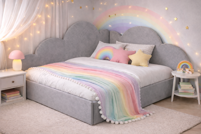 • Tăblie tapițată tip „norișori”, cu design atractiv pentru copii