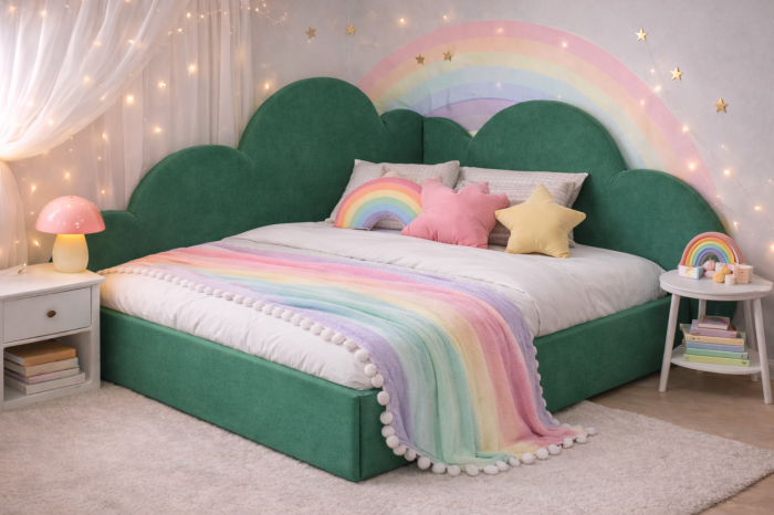 • Tăblie tapițată tip „norișori”, cu design atractiv pentru copii