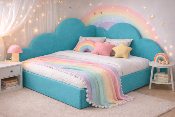 • Tăblie tapițată tip „norișori”, cu design atractiv pentru copii