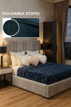 Acest pat tapițat impresionează prin designul modern și materialele de înaltă calitate,