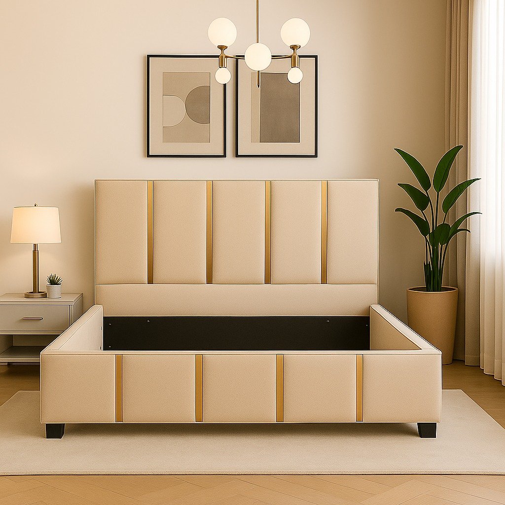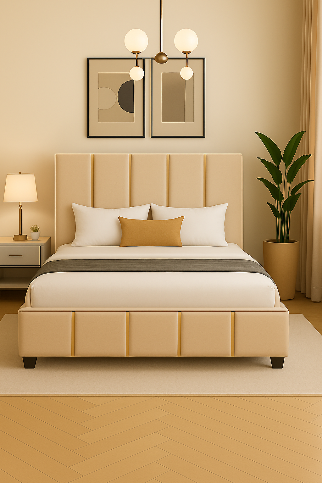 Un pat modern, tapițat în stofă elegantă, cu tăblie înaltă și detalii verticale decorative. Oferă confort, stabilitate și un design rafinat, perfect pentru a crea un dormitor cald și stilat.