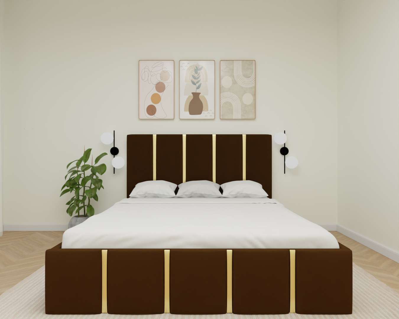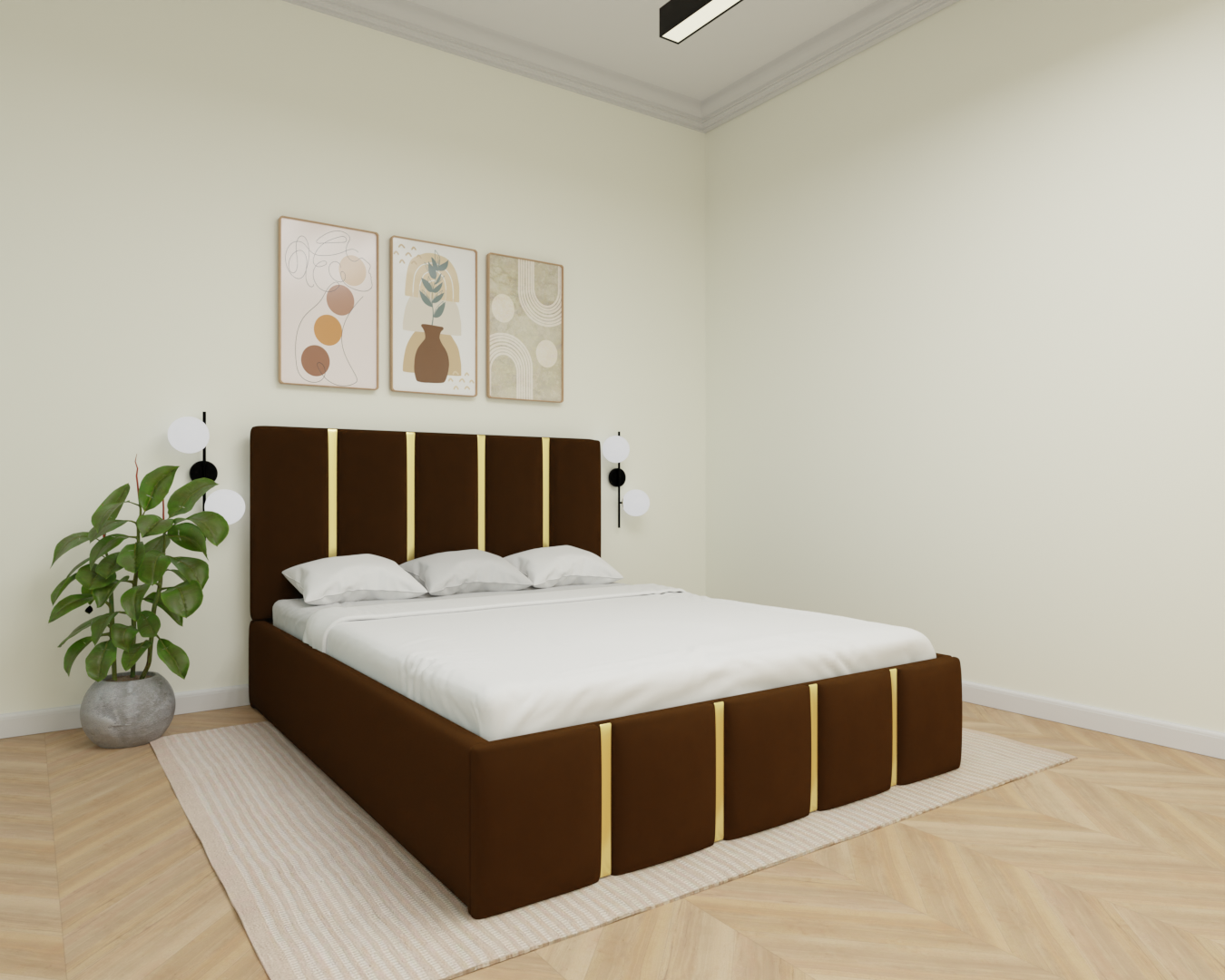 Un pat modern, tapițat în stofă elegantă, cu tăblie înaltă și detalii verticale decorative. Oferă confort, stabilitate și un design rafinat, perfect pentru a crea un dormitor cald și stilat.