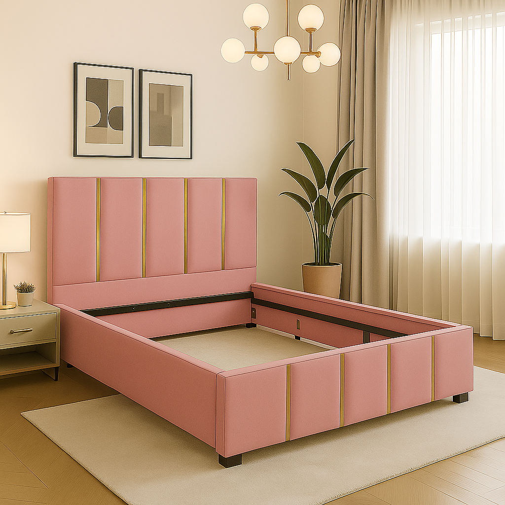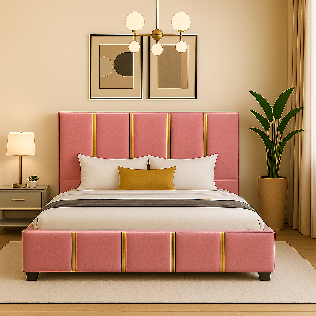 Un pat modern, tapițat în stofă elegantă, cu tăblie înaltă și detalii verticale decorative. Oferă confort, stabilitate și un design rafinat, perfect pentru a crea un dormitor cald și stilat.