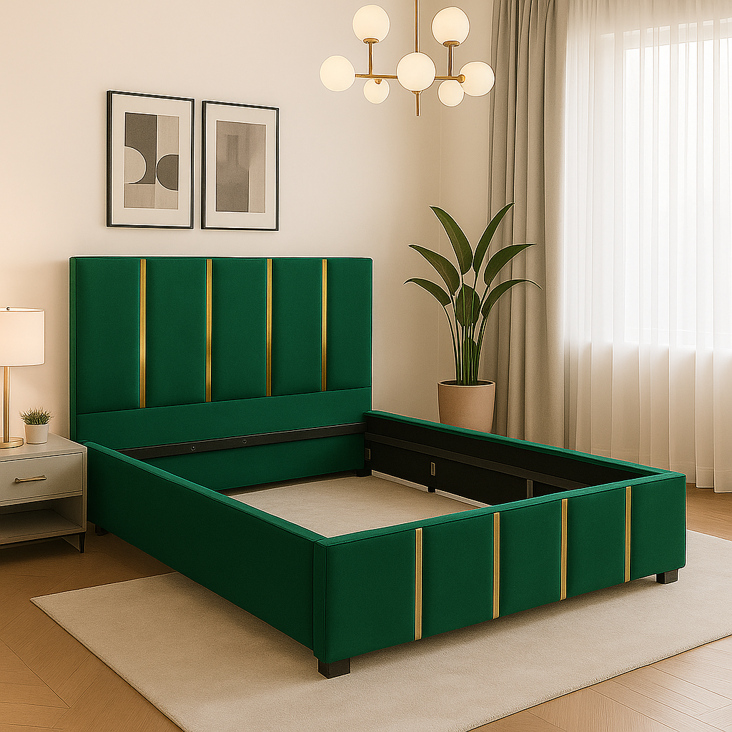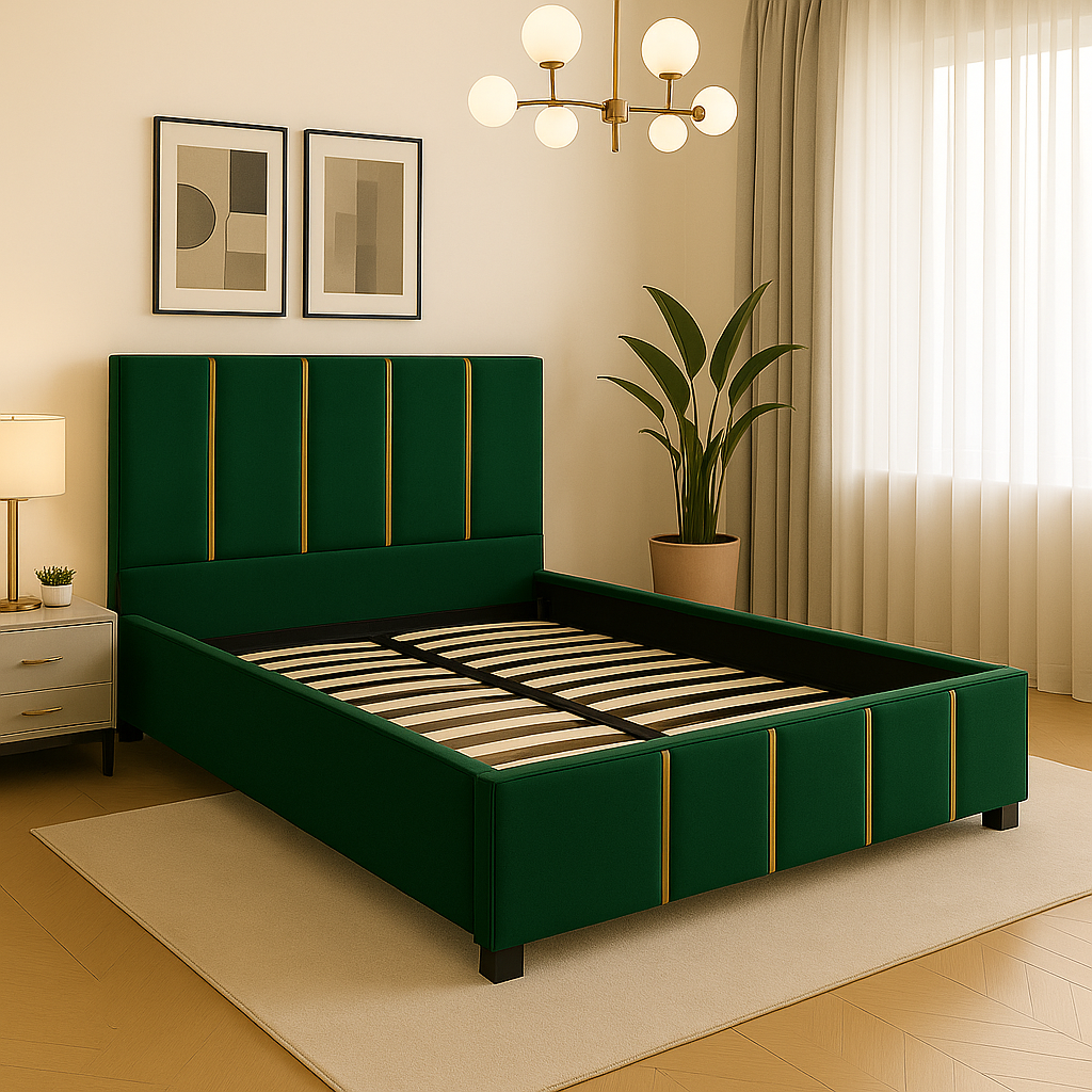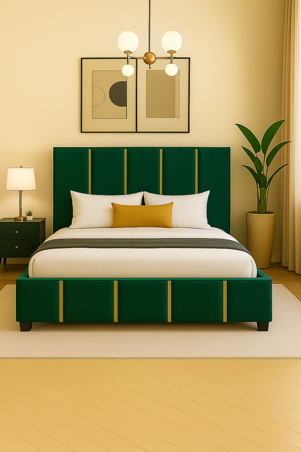 Un pat modern, tapițat în stofă elegantă, cu tăblie înaltă și detalii verticale decorative. Oferă confort, stabilitate și un design rafinat, perfect pentru a crea un dormitor cald și stilat.