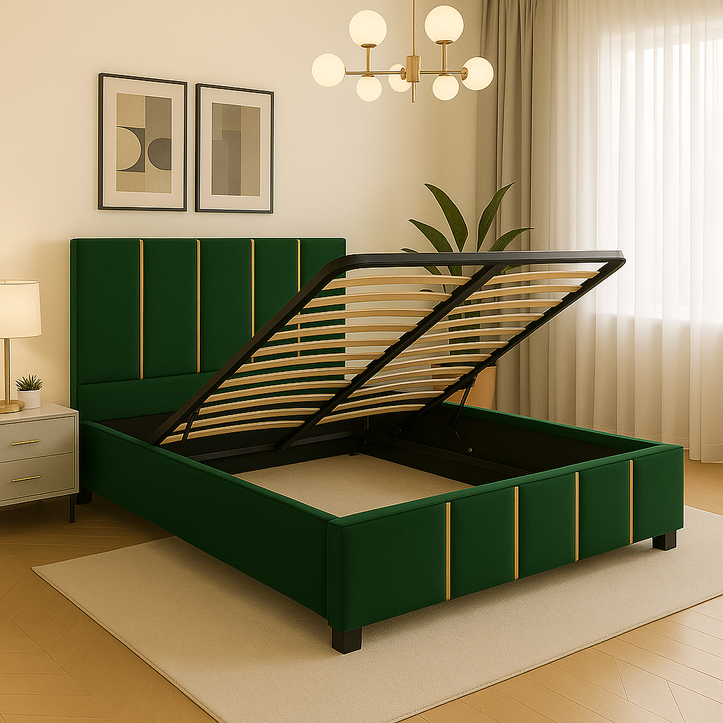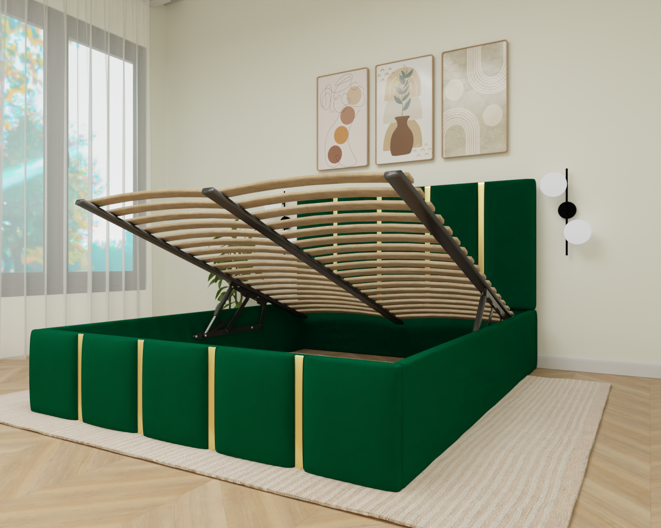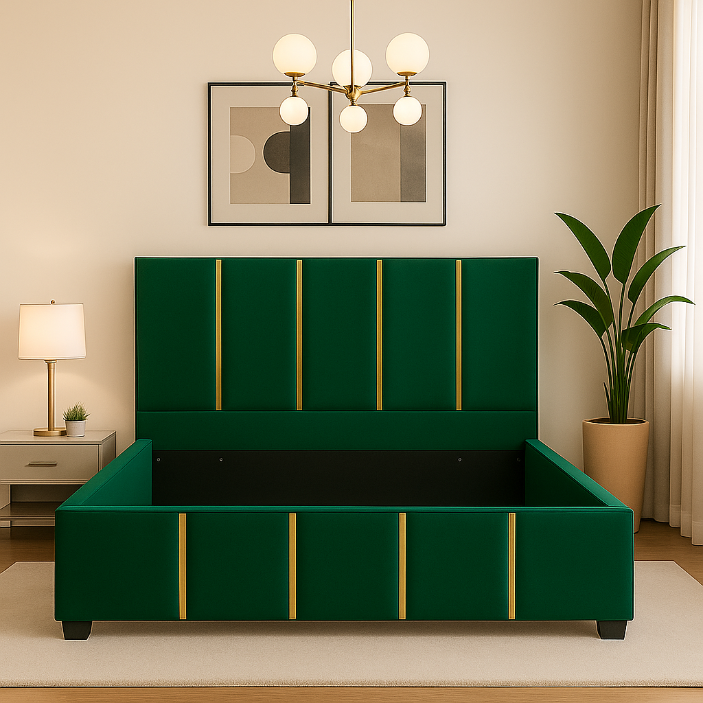 Un pat modern, tapițat în stofă elegantă, cu tăblie înaltă și detalii verticale decorative. Oferă confort, stabilitate și un design rafinat, perfect pentru a crea un dormitor cald și stilat.
