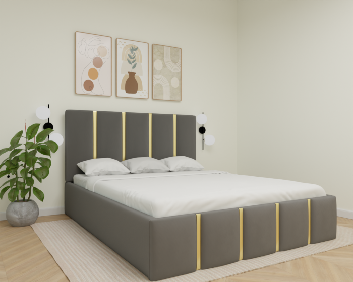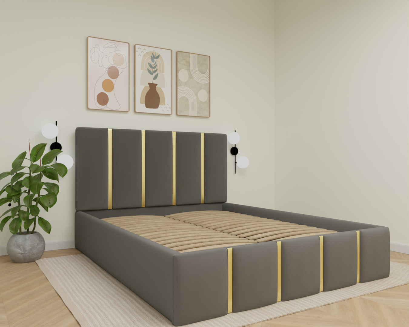 Un pat modern, tapițat în stofă elegantă, cu tăblie înaltă și detalii verticale decorative. Oferă confort, stabilitate și un design rafinat, perfect pentru a crea un dormitor cald și stilat.