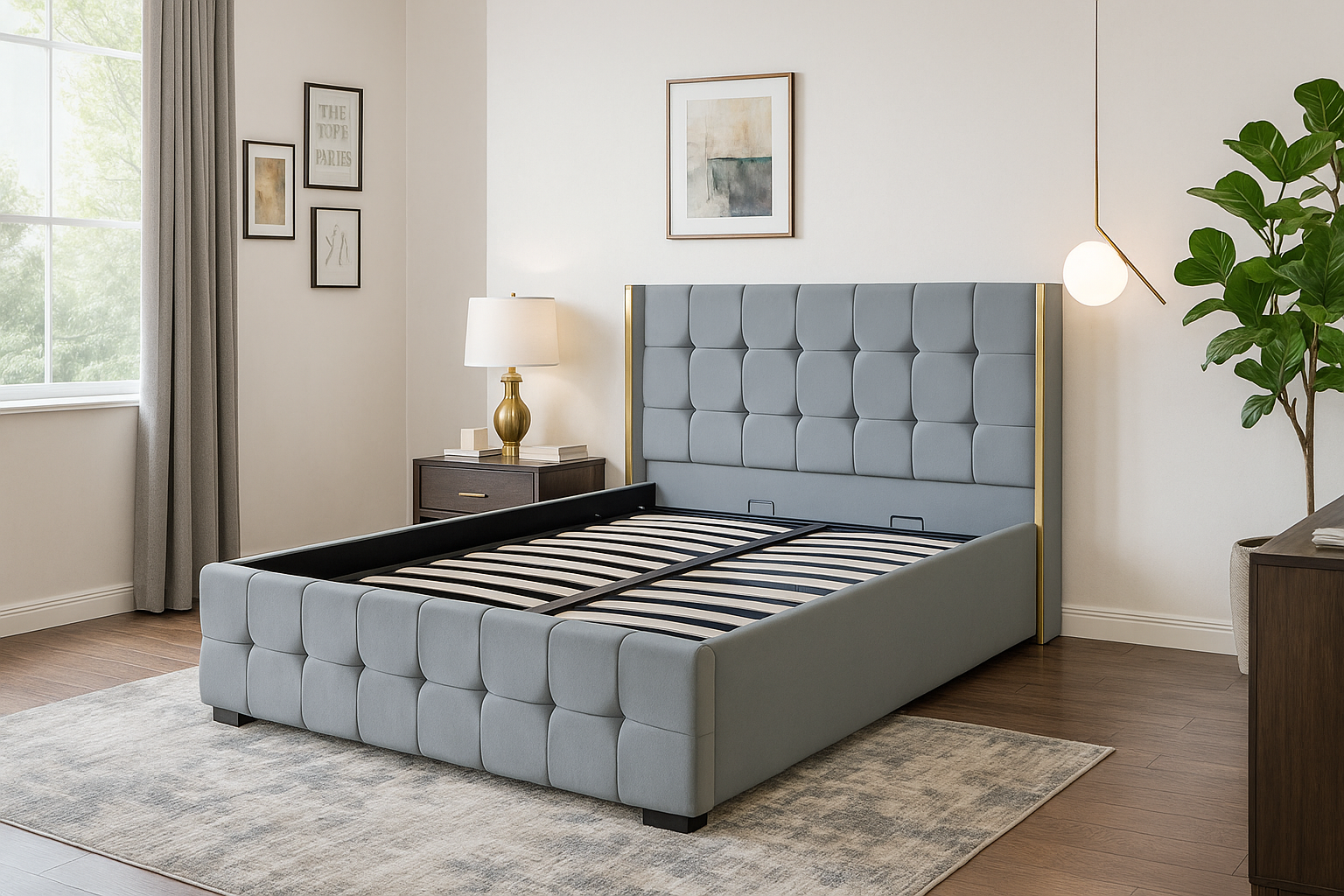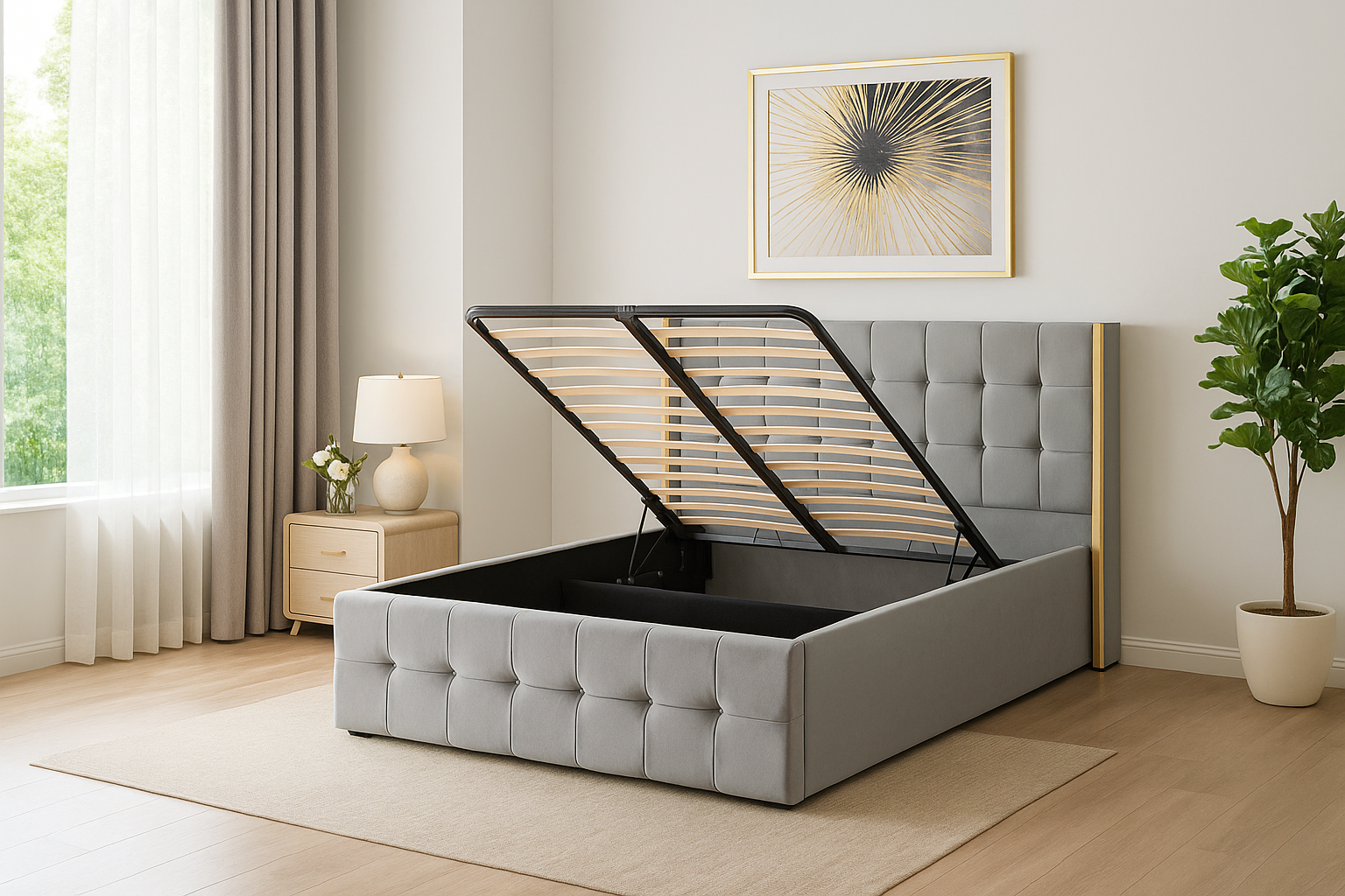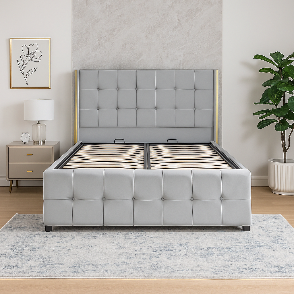 Somiera se ridică ușor, iar spațiul de depozitare e încăpător.
