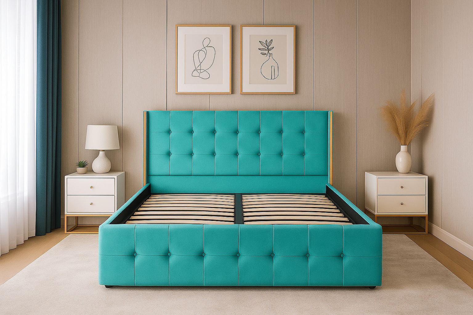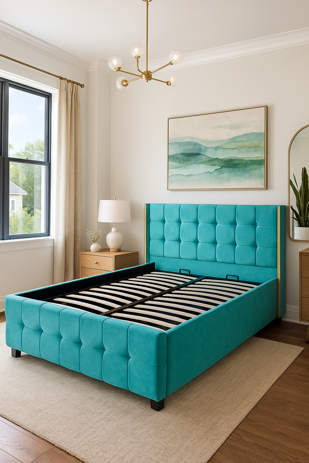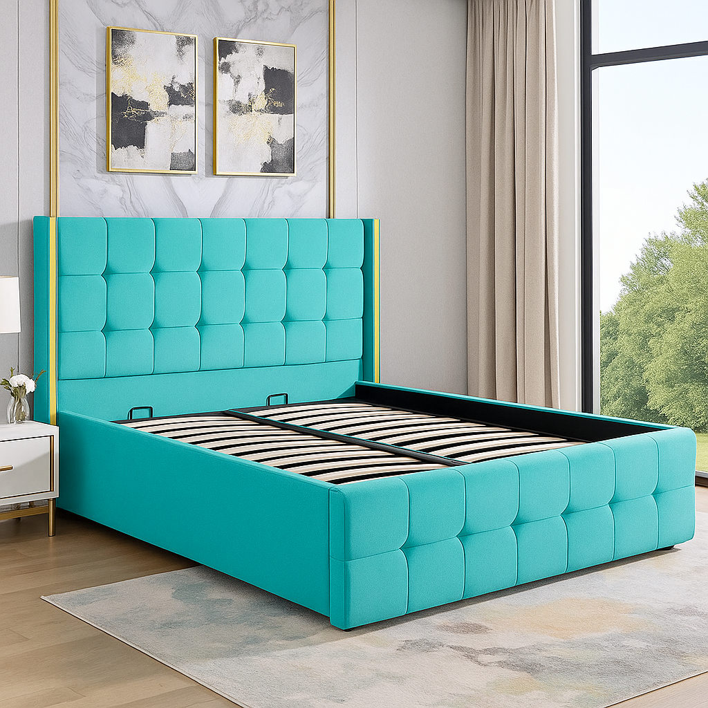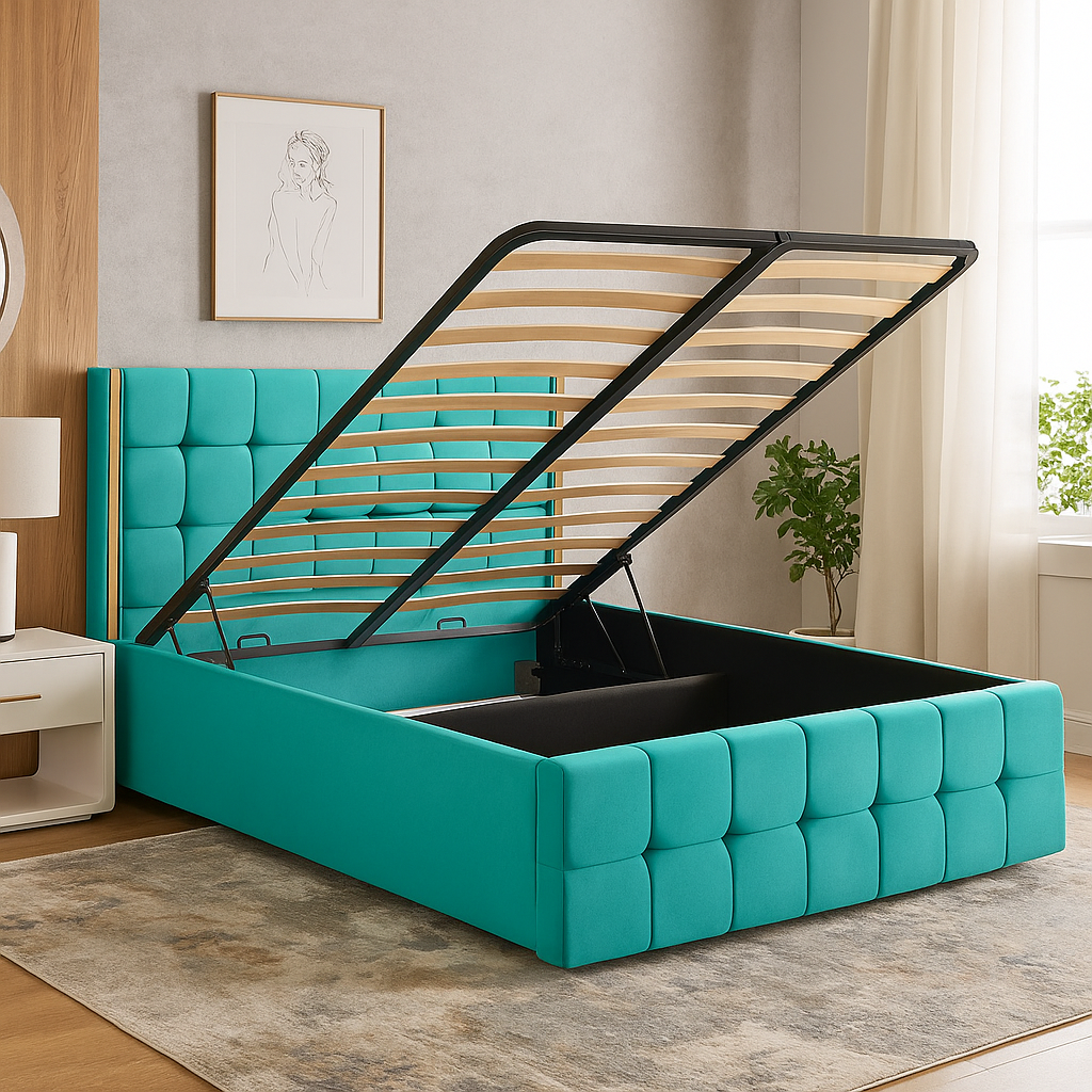 Somiera se ridică ușor, iar spațiul de depozitare e încăpător.