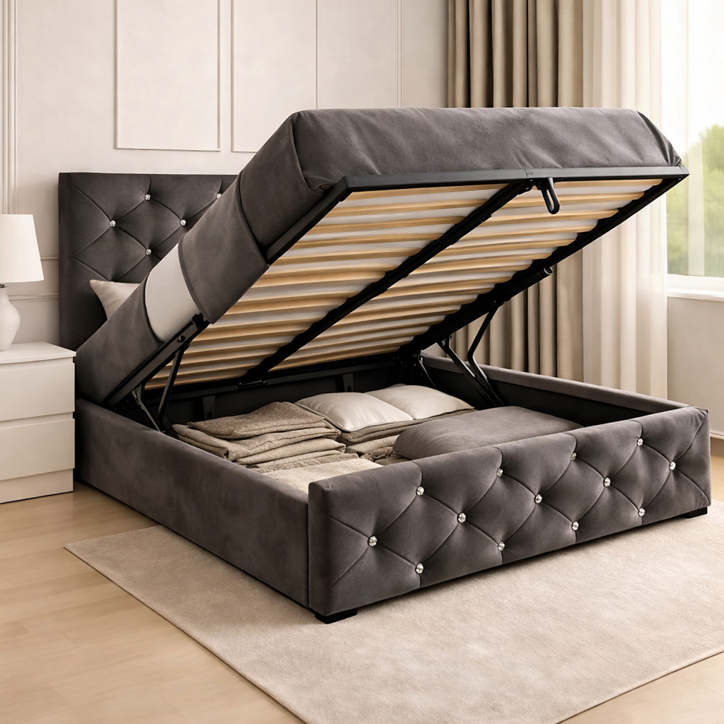Tapițeria din stofă oferă un aspect plăcut și o senzație de confort, fiind ușor de integrat în diferite stiluri de amenajare. Structura solidă din PAL asigură rezistență și stabilitate, iar somiera rabatabila oferă un suport sigur și durabil pentru saltea, cat si spatiu de depozitare.