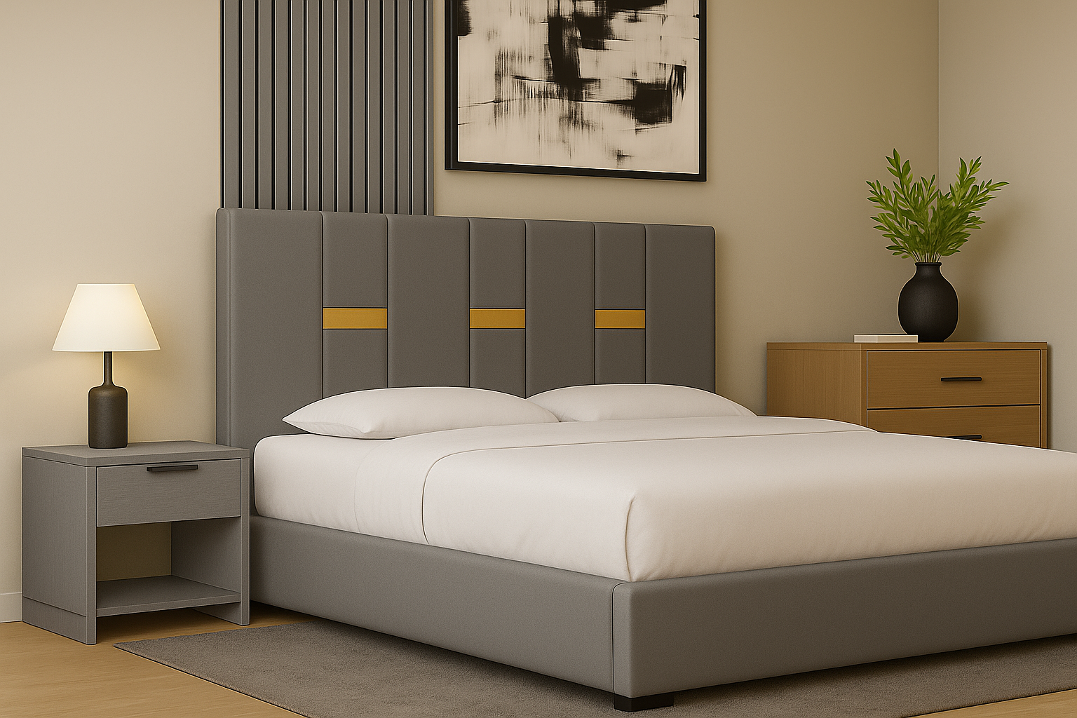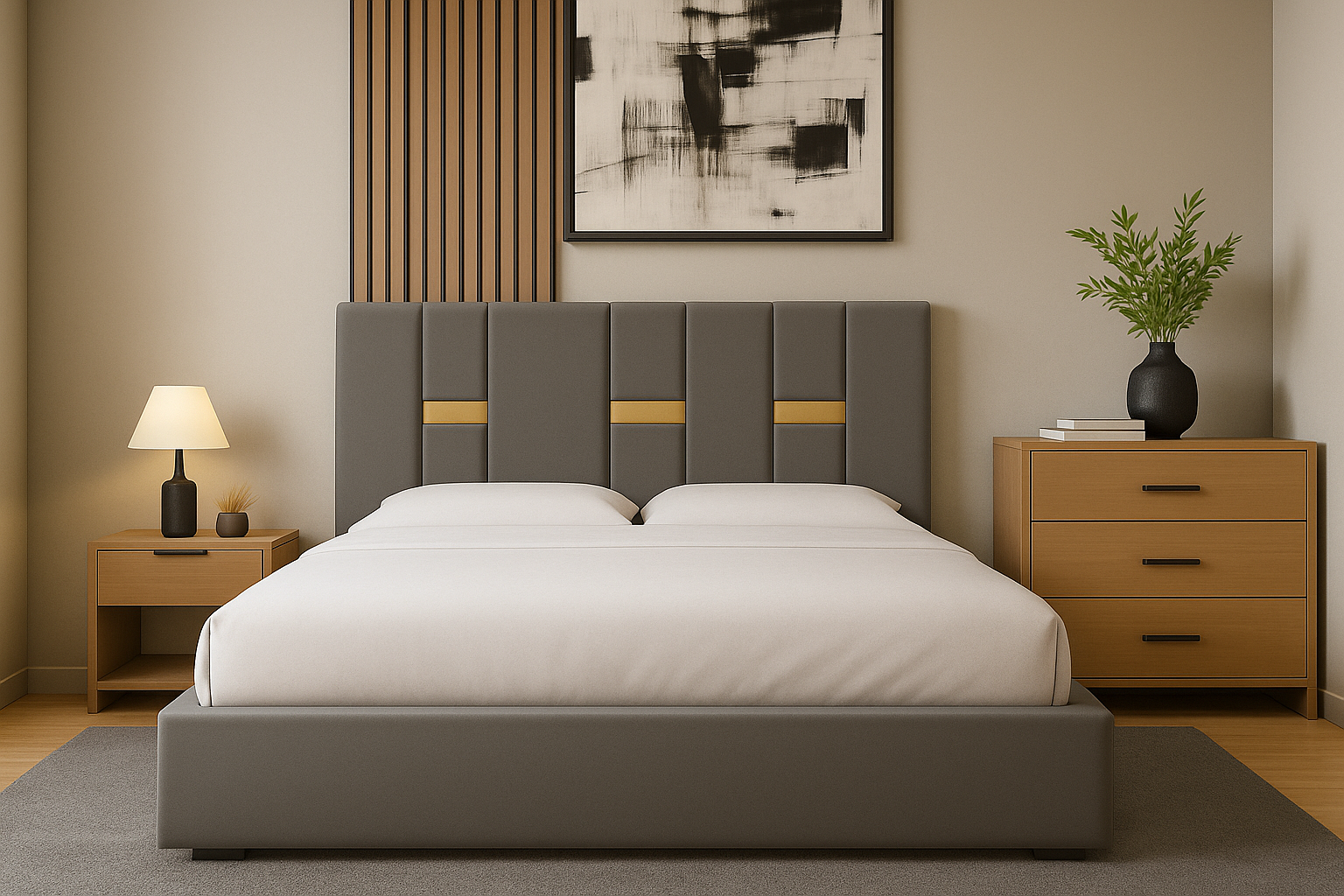 Un pat modern, tapițat în stofă elegantă, cu tăblie înaltă și detalii verticale decorative. Oferă confort, stabilitate și un design rafinat, perfect pentru a crea un dormitor cald și stilat.