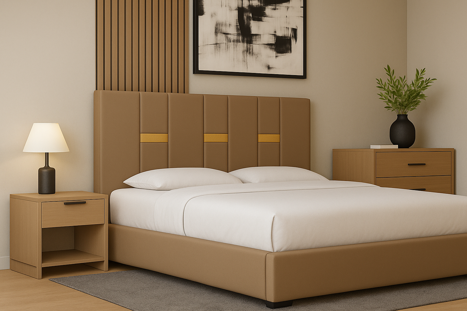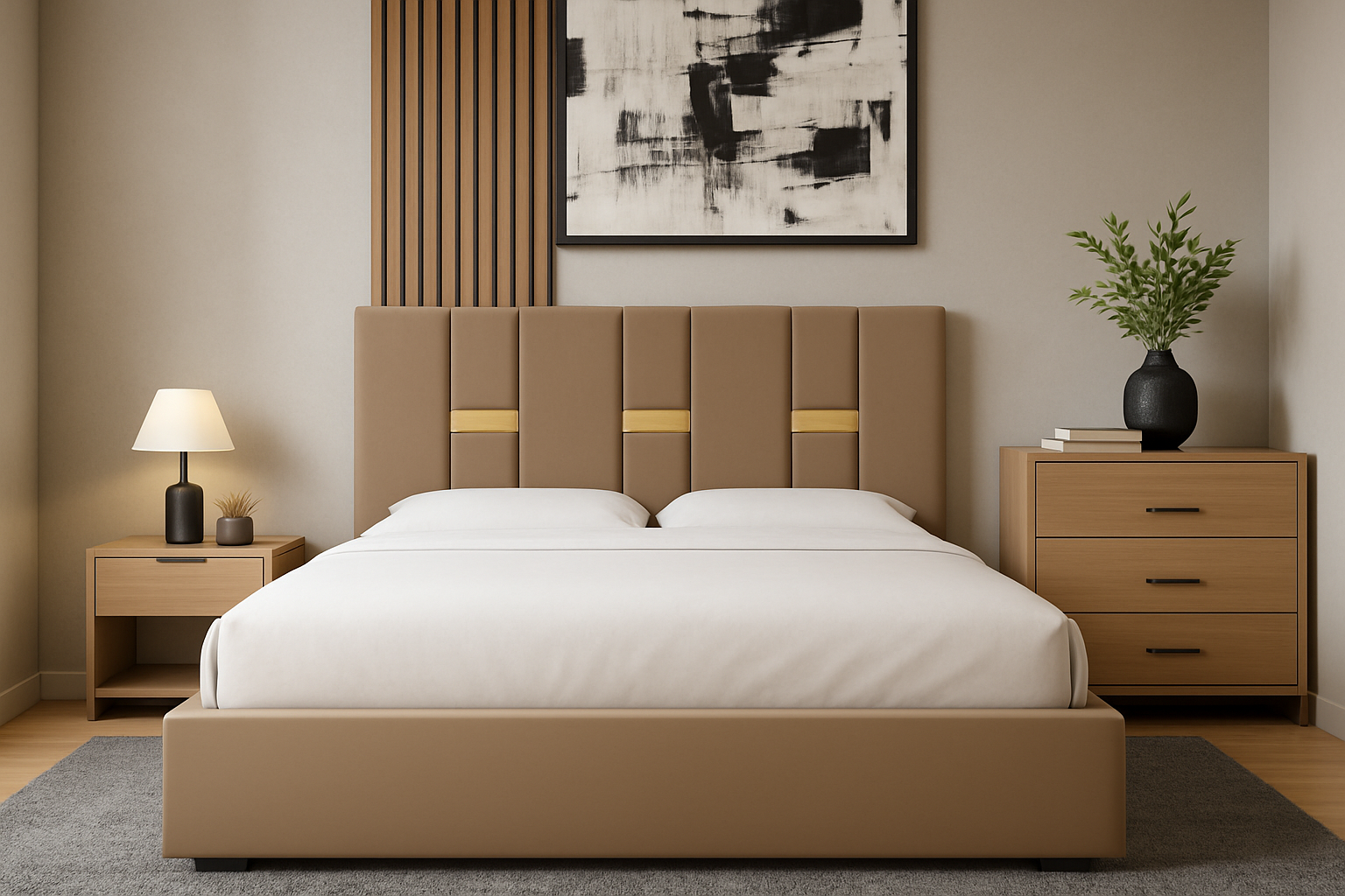 Un pat modern, tapițat în stofă elegantă, cu tăblie înaltă și detalii verticale decorative. Oferă confort, stabilitate și un design rafinat, perfect pentru a crea un dormitor cald și stilat.