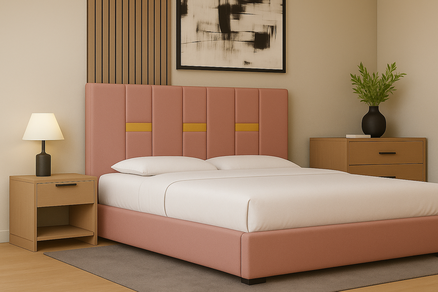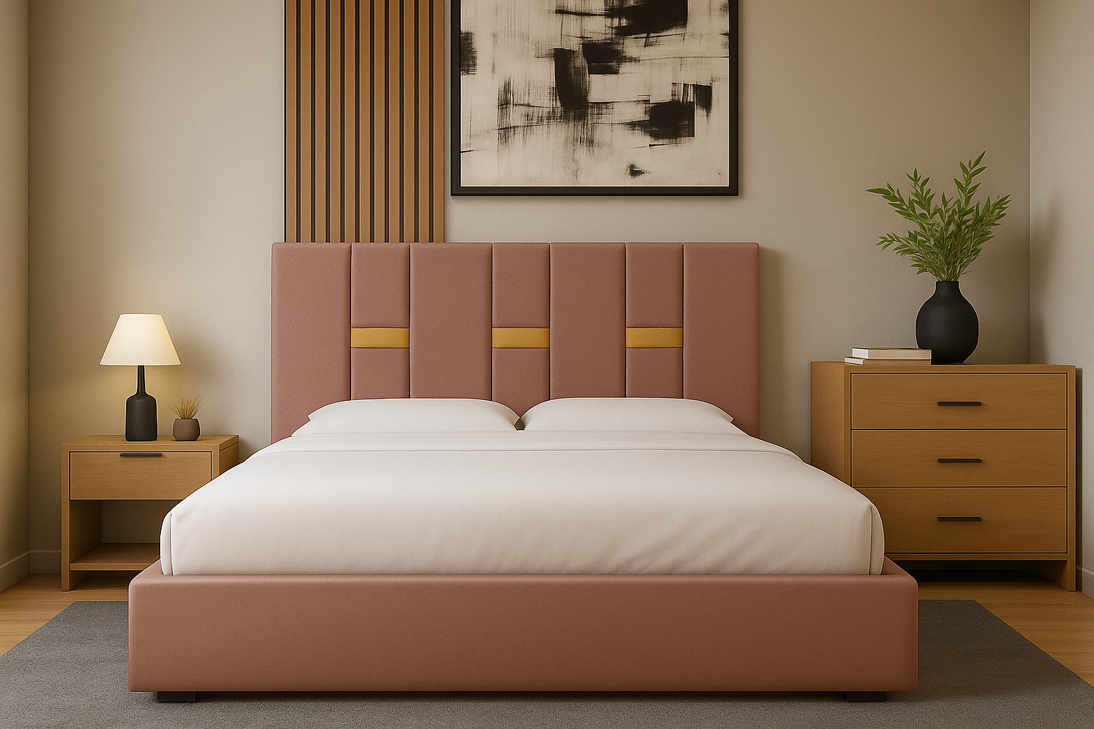 Un pat modern, tapițat în stofă elegantă, cu tăblie înaltă și detalii verticale decorative. Oferă confort, stabilitate și un design rafinat, perfect pentru a crea un dormitor cald și stilat.