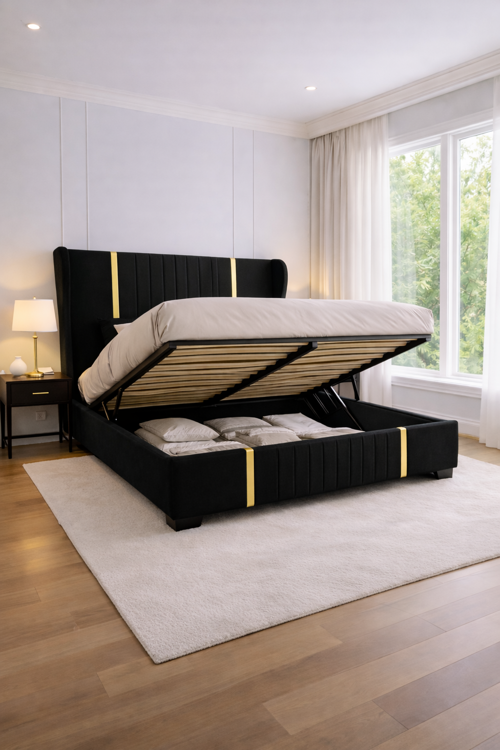 ✔️ Spațiu generos de depozitare integrat, perfect pentru lenjerii, perne sau textile