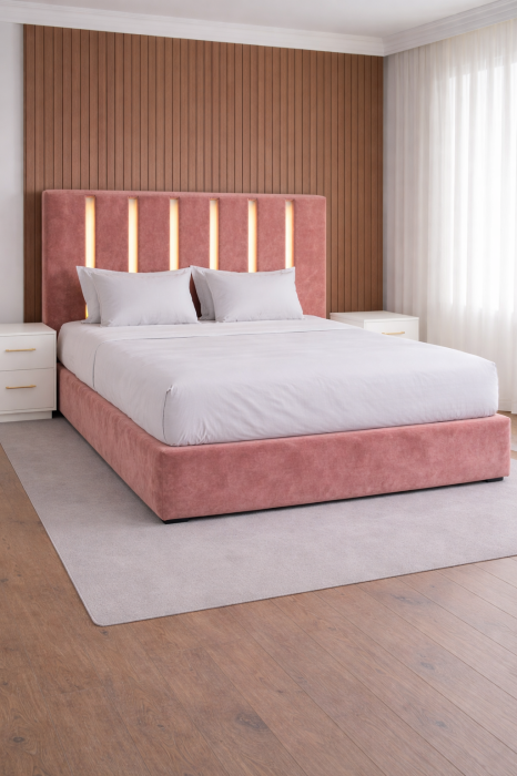 Tăblia înaltă, tapițată premium și evidențiată prin inserții verticale decorative, oferă un plus de rafinament și confort, devenind punctul central al încăperii. Liniile curate și proporțiile echilibrate fac din ZOE alegerea ideală pentru interioare moderne, minimaliste sau contemporane.
