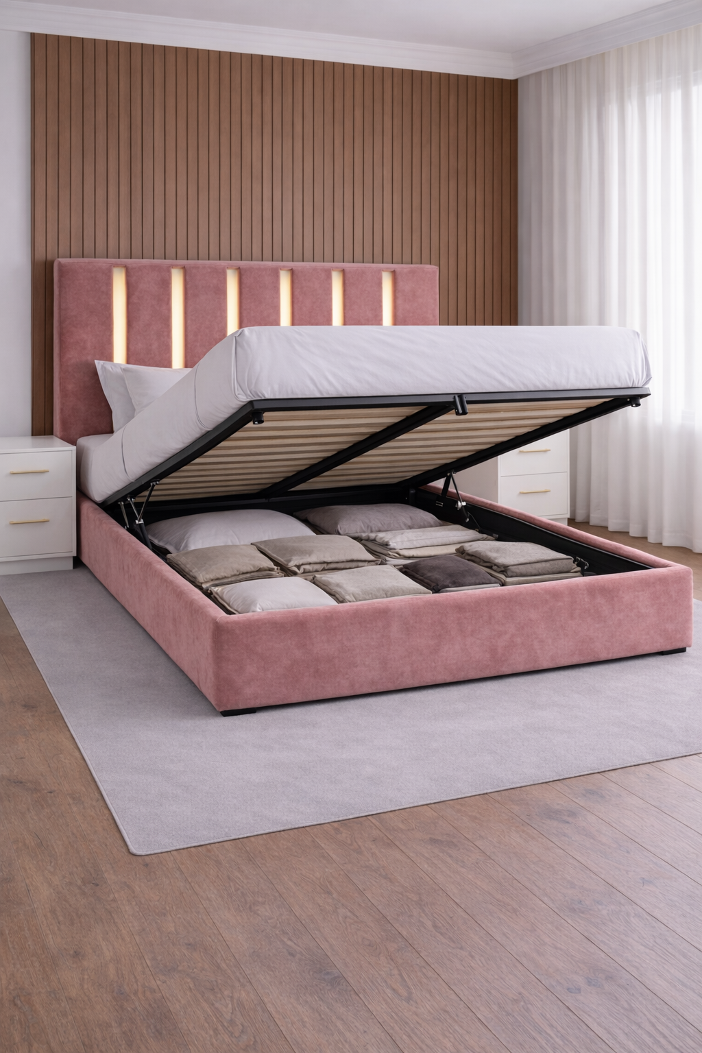 Patul ZOE este prevăzut cu somieră rabatabilă metalică și sistem de ridicare cu pistoane hidraulice, care permite acces facil la lada de depozitare generoasă. Spațiul de sub saltea este perfect pentru păstrarea lenjeriilor, pilotelor, pernelor sau altor obiecte, contribuind la un dormitor ordonat și aerisit.