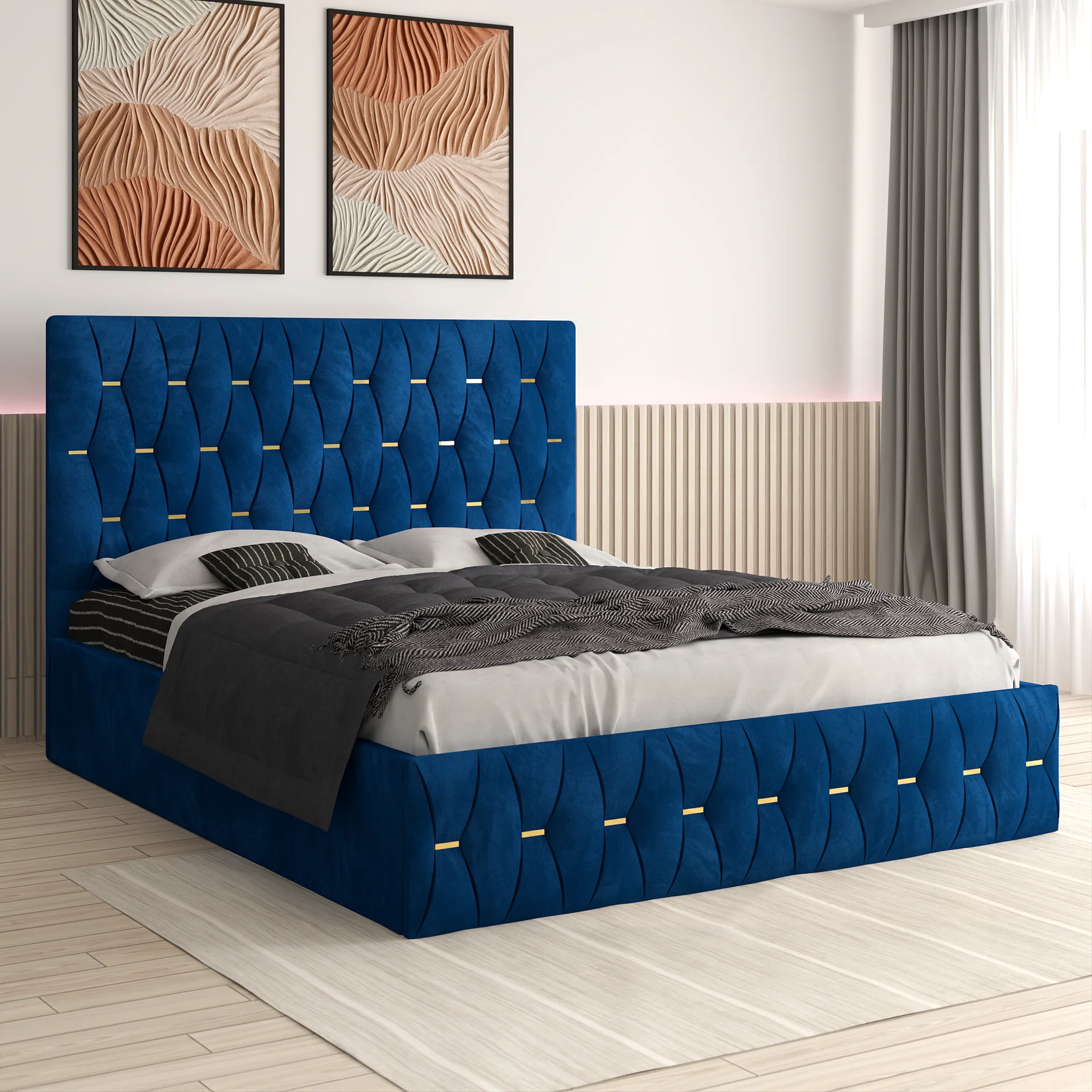 este un pat modern și elegant, cu tapițerie fină, detalii geometrice și accente aurii ce oferă un aer sofisticat dormitorului. Tablia mare a patului asigură confort sporit, iar structura solidă garantează durabilitate.