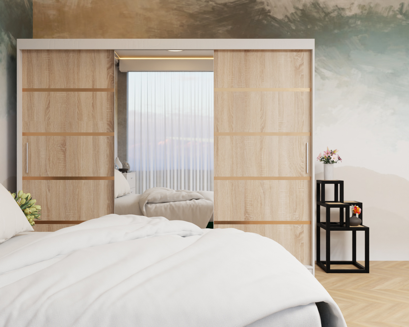 Dormitor: Lotus Pat Tapitat Dressing 250x200 Alb&Sonoma 3 Usi cu Oglinda