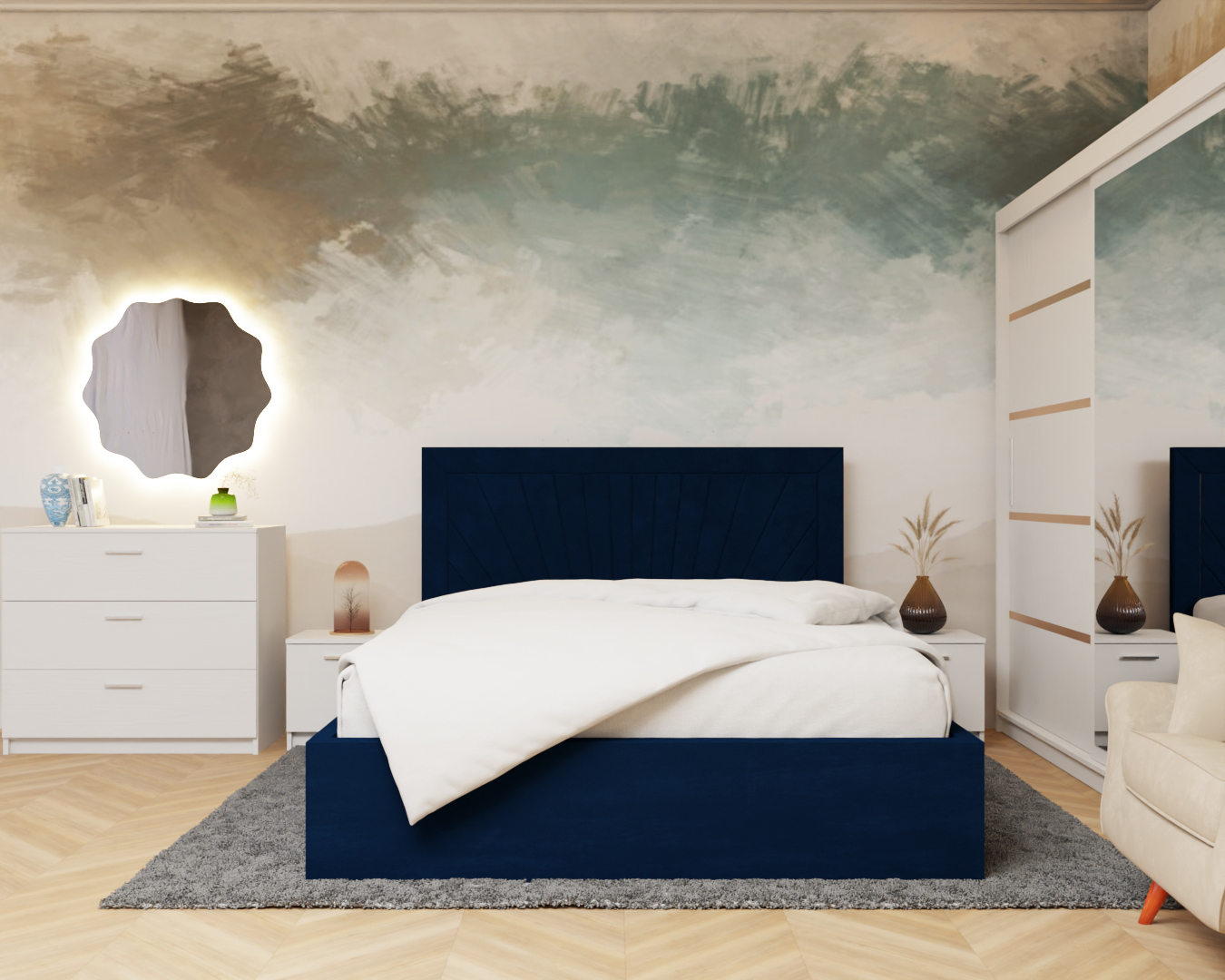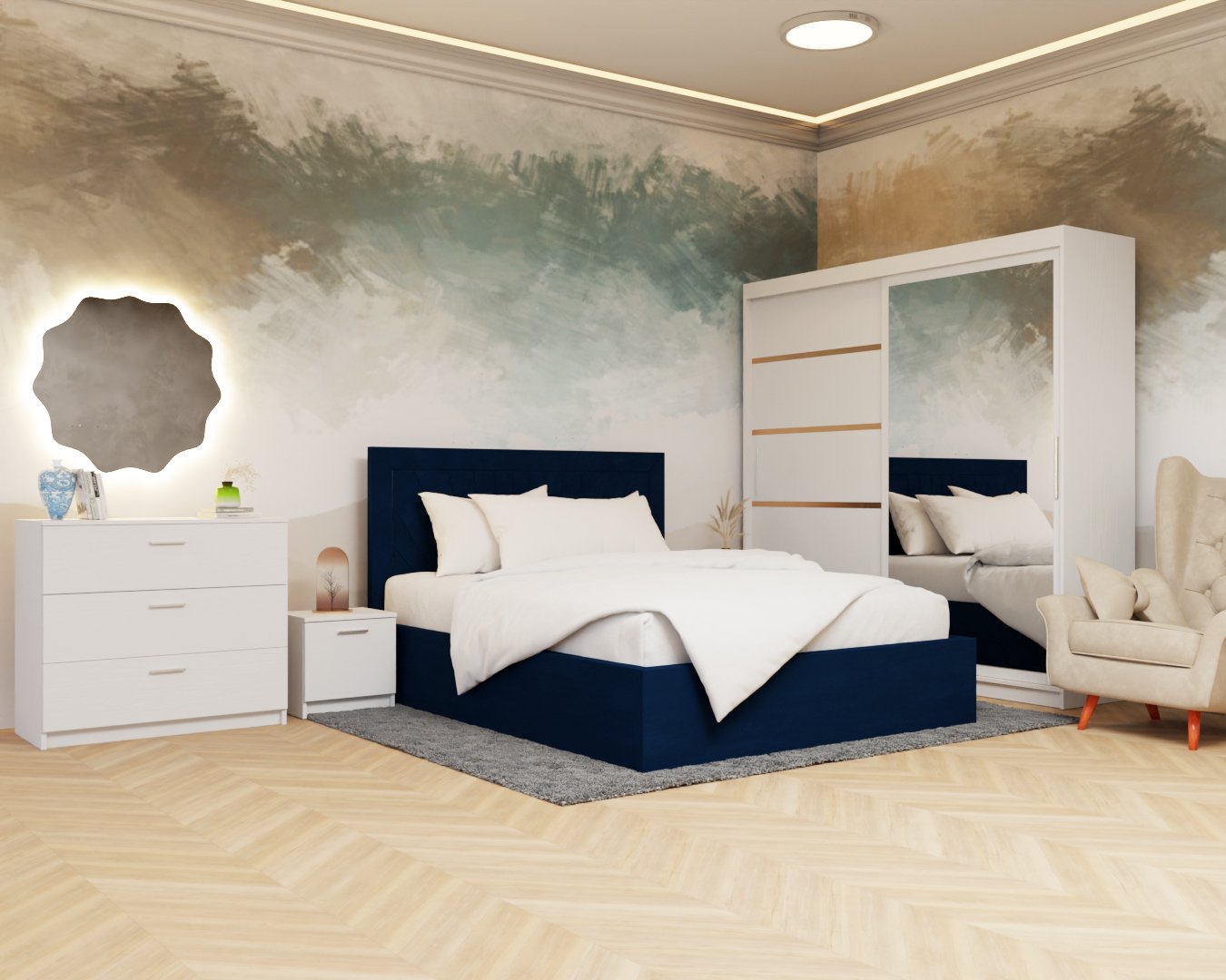 Dormitor Lotus Pat Tapitat Dressing 200x200 Alb cu oglinda