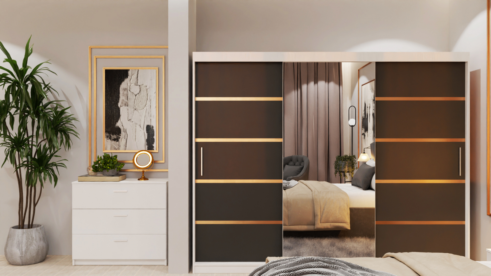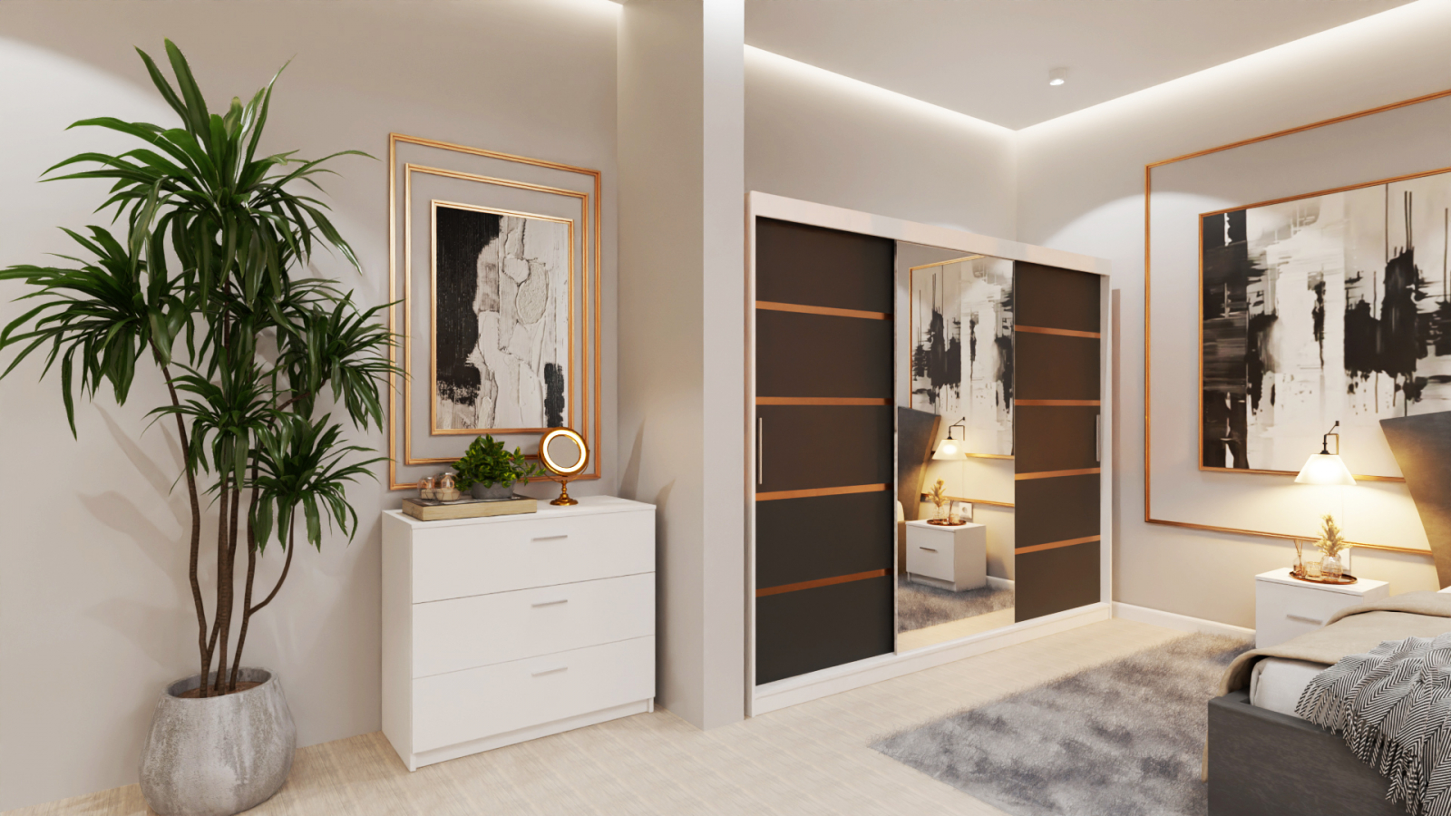 Dormitor Lucas Tapitat Stofa Gri cu dulap 250*200 usi glisante Alb&Antracit cu Oglinda, noptiere si comoda