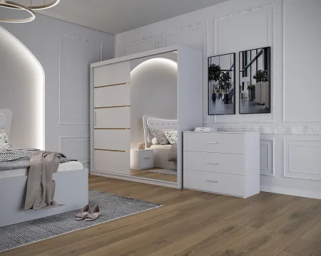 Dormitor Vista cu Pat Tapitat cu dulap 200*200 usi glisante, noptiere si comoda