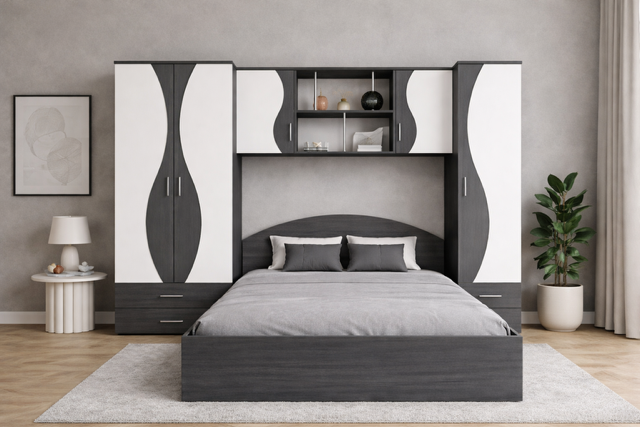 Tăblie arcuită, linii elegante și funcționalitate ridicată, ideal pentru un dormitor contemporan și bine organizat.