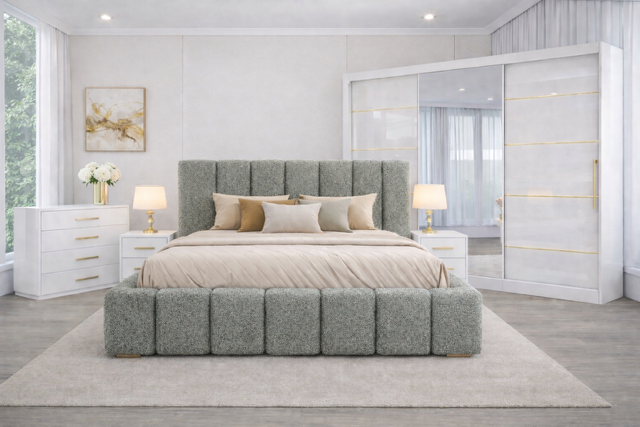 SET DORMITOR DIN MDF LUCIOS CU DULAP DE 250X 200CM , 2NOPTIERE, COMODA SI PAT TAPITAT CU SOMIERA RABATABILA SI LADA DE DEPOZITARE
