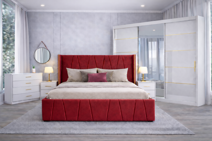 Dulapul impresionează prin finisajul din MDF lucios, care reflectă lumina și conferă încăperii un aspect spațios și aerisit. Liniile aurii decorative completează perfect estetica patului, creând un ansamblu unitar și sofisticat. Sistemul de glisare asigură funcționalitate și economie de spațiu.