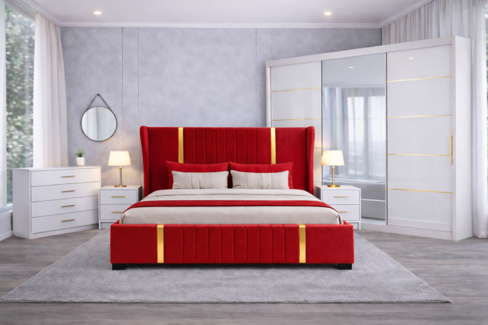 Dulapul impresionează prin finisajul din MDF lucios, care reflectă lumina și conferă încăperii un aspect spațios și aerisit. Liniile aurii decorative completează perfect estetica patului, creând un ansamblu unitar și sofisticat. Sistemul de glisare asigură funcționalitate și economie de spațiu.