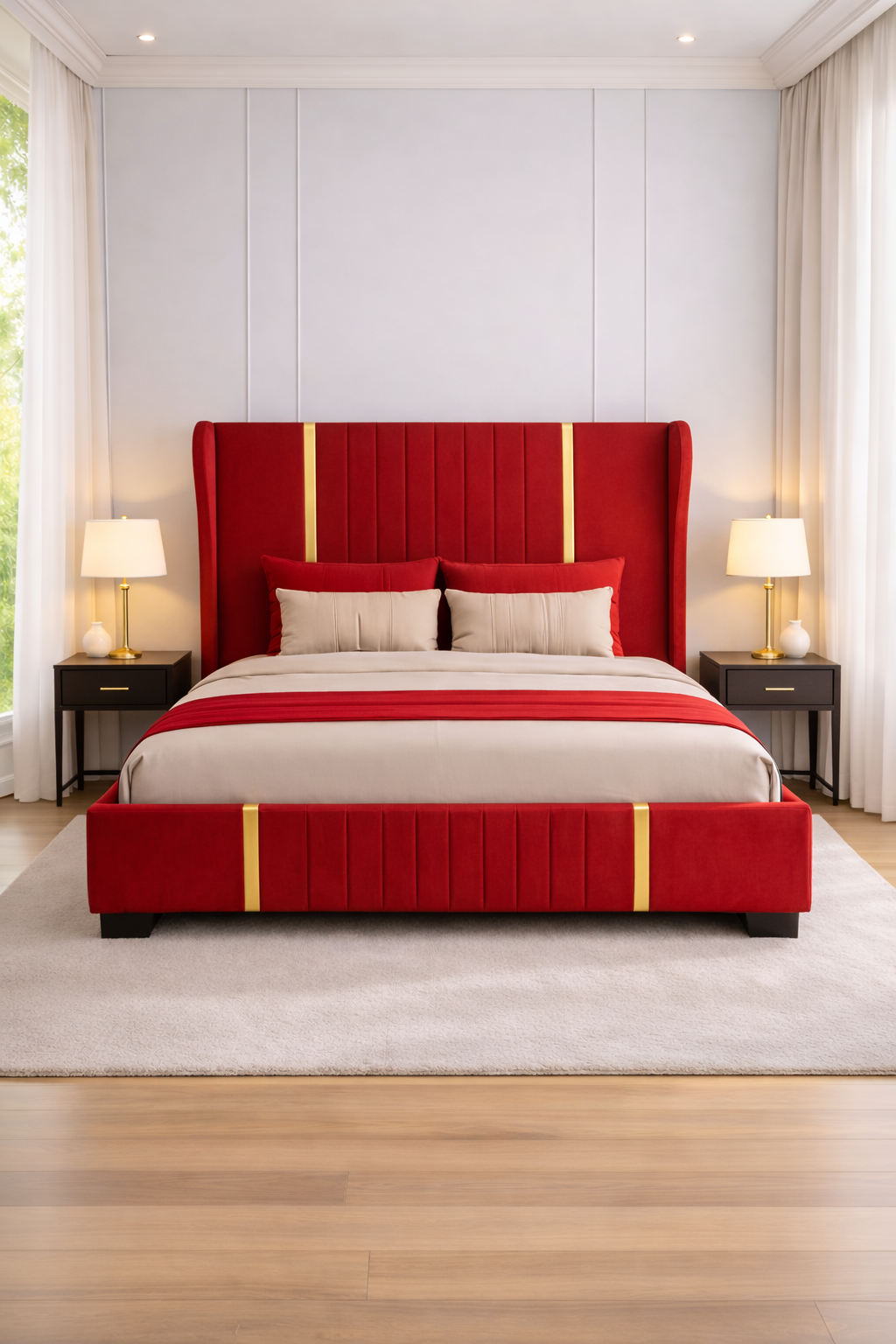 Piesa centrală a colecției este patul tapițat, îmbrăcat într-un material textil fin, într-o nuanță elegantă de bej. Tăblia înaltă, segmentată vertical, creează un efect vizual modern și impunător, în timp ce inserțiile aurii subtile adaugă un plus de rafinament. Designul său oferă atât confort, cât și stabilitate, fiind ideal pentru un ambient relaxant.