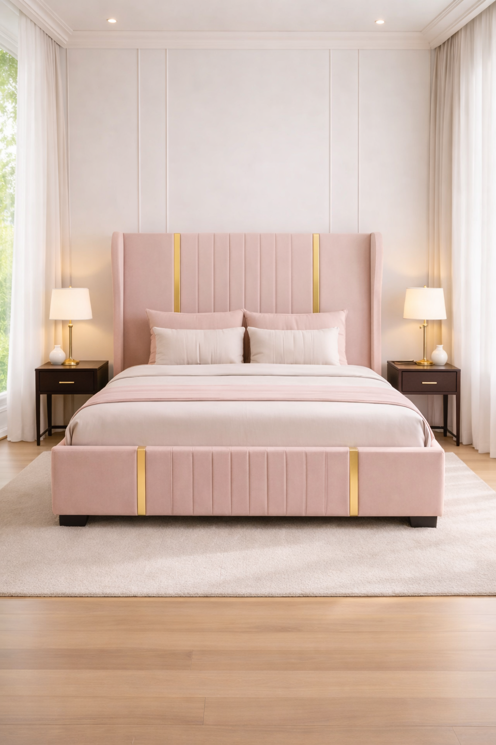 Piesa centrală a colecției este patul tapițat, îmbrăcat într-un material textil fin, într-o nuanță elegantă de bej. Tăblia înaltă, segmentată vertical, creează un efect vizual modern și impunător, în timp ce inserțiile aurii subtile adaugă un plus de rafinament. Designul său oferă atât confort, cât și stabilitate, fiind ideal pentru un ambient relaxant.