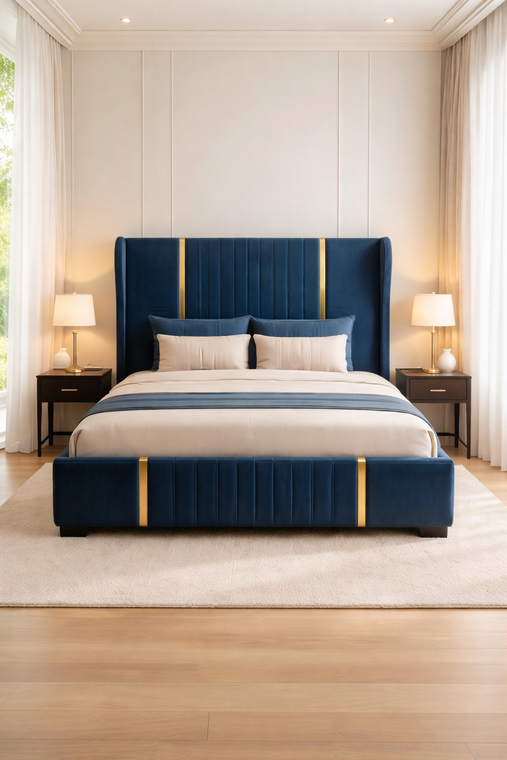 Piesa centrală a colecției este patul tapițat, îmbrăcat într-un material textil fin, într-o nuanță elegantă de bej. Tăblia înaltă, segmentată vertical, creează un efect vizual modern și impunător, în timp ce inserțiile aurii subtile adaugă un plus de rafinament. Designul său oferă atât confort, cât și stabilitate, fiind ideal pentru un ambient relaxant.