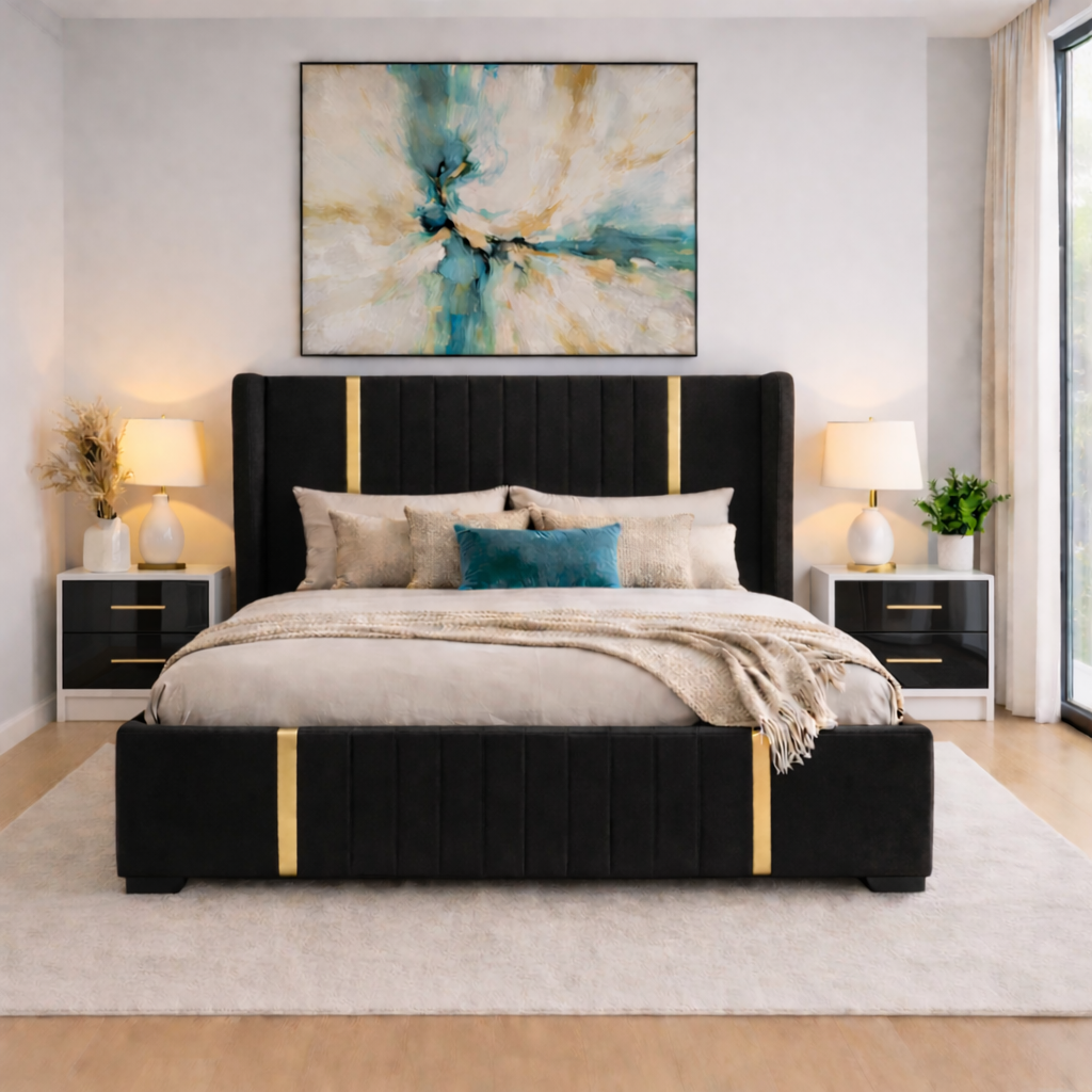 Piesa centrală a colecției este patul tapițat, îmbrăcat într-un material textil fin, într-o nuanță elegantă de bej. Tăblia înaltă, segmentată vertical, creează un efect vizual modern și impunător, în timp ce inserțiile aurii subtile adaugă un plus de rafinament. Designul său oferă atât confort, cât și stabilitate, fiind ideal pentru un ambient relaxant.
