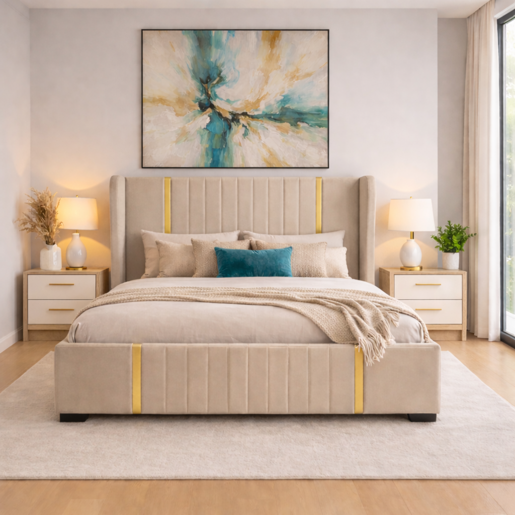 Piesa centrală a colecției este patul tapițat, îmbrăcat într-un material textil fin, într-o nuanță elegantă de bej. Tăblia înaltă, segmentată vertical, creează un efect vizual modern și impunător, în timp ce inserțiile aurii subtile adaugă un plus de rafinament. Designul său oferă atât confort, cât și stabilitate, fiind ideal pentru un ambient relaxant.