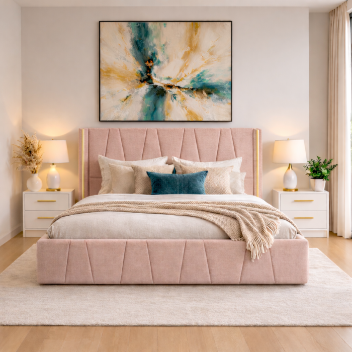 Set dormitor modern Eva – format din pat tapițat și 2 noptiere elegante