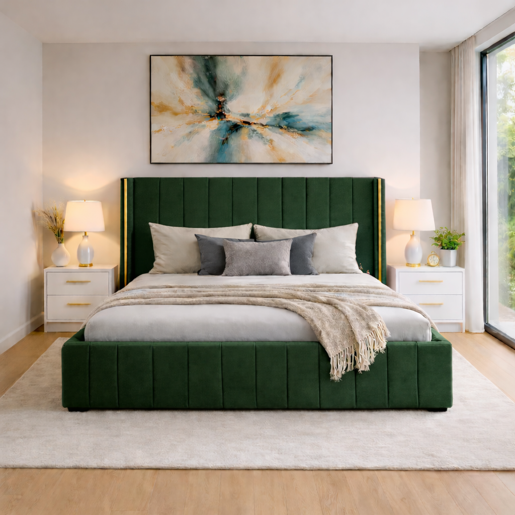 Set pentru dormitor modern Golden – format din pat tapițat și 2 noptiere elegante